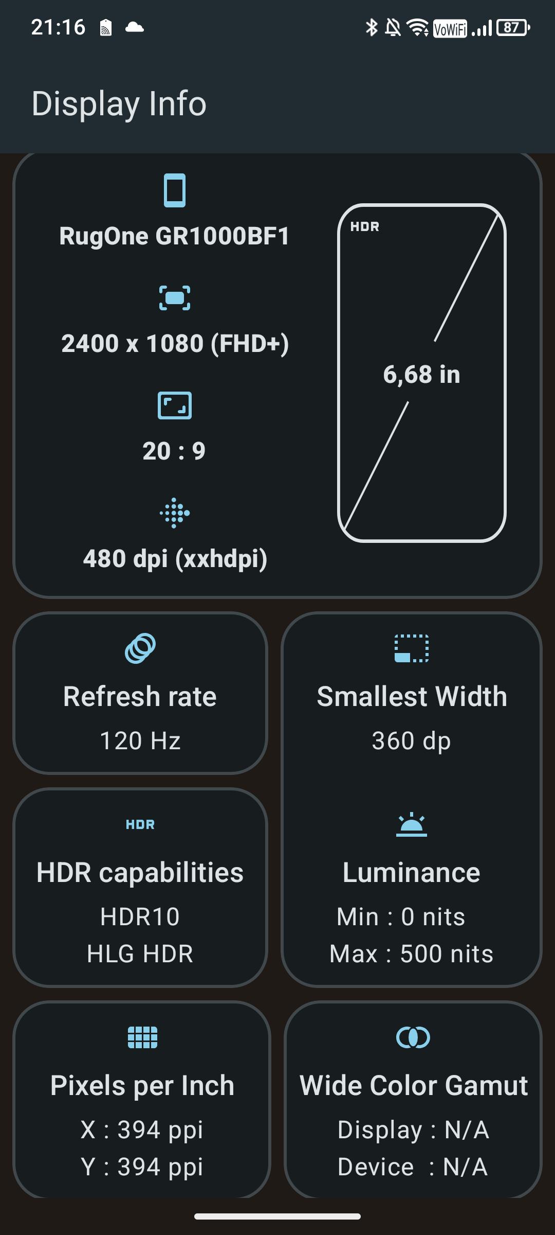 Das 6,67 Zoll große AMOLED-Display des Rugone Xever 7 Pro überzeugt durch seine gute maximale Helligkeit und erreicht mit einer Auflösung von 2400 x 1080 Pixeln eine gute Pixeldichte von 394 Pixeln pro Zoll. Einzelne Pixel sind definitiv nicht mehr zu erkennen. Ebenso stark ist die maximale Helligkeit von 1858 Lux im Sonnenlicht. Dafür muss aber in den Einstellungen der Boost aktiviert werden. AMOLED-typisch sind die Kontraste exzellent und auch die seitliche Ablesbarkeit ist hervorragend. Ab Werk sind die Farben sehr lebendig, können aber im System an die eigenen Bedürfnisse angepasst werden. Die maximale Bildwiederholungsfrequenz beträgt 120 Hertz und wird bei Bedarf zuverlässig reduziert.