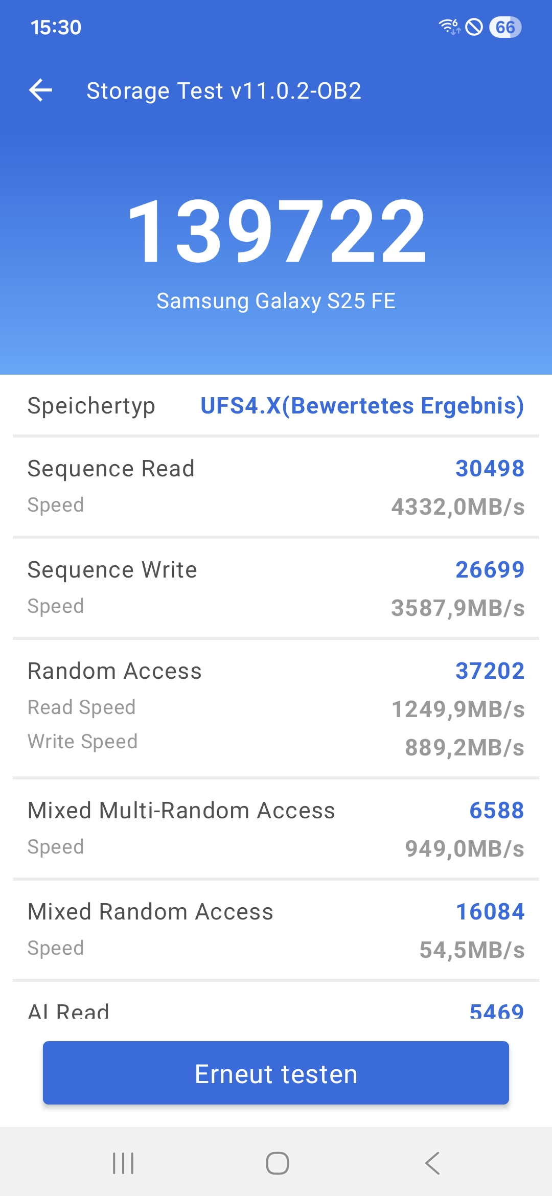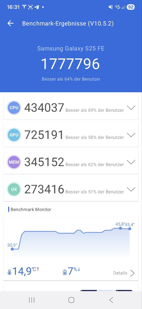 Dennoch läuft das System mit dieser Leistung problemlos flüssig. Es kam nie zu Rucklern oder Verzögerungen und der UFS-4-Speicher liefert mit 4332 / 3588 MB/s gute Lese-/Schreibraten. Kritikwürdig ist hingegen die Entscheidung von Samsung, überhaupt eine 128GB-Version anzubieten, und 8GB RAM LPDDR5 sind auch nicht die feine englische Art. Für diesen Preis ist das weder in der Mittelklasse noch bei einem Fast-Flaggschiff angemessen.