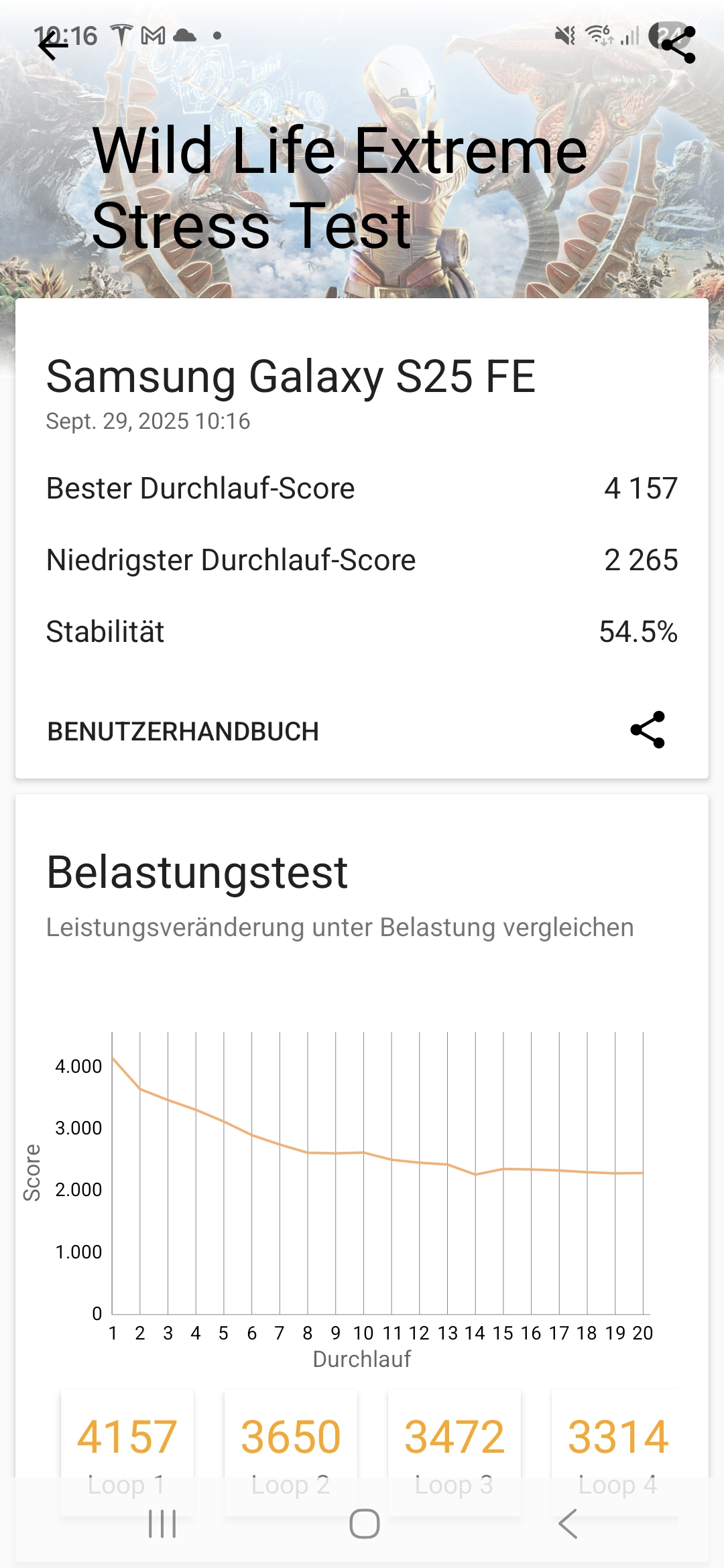 Für eine ausreichende Grafikleistung sorgt eine Xclipse-940-GPU. Mit Googles Tensor-Prozessoren kann das Samsung Galaxy S25 FE im gleichen Preisbereich mithalten. Konkurrenten mit einem halbwegs aktuellen Snapdragon- oder Dimensity-Chipsatz haben jedoch eine deutlich höhere CPU- und GPU-Leistung, sowohl in den Benchmarks als auch in Bezug auf die Zukunftssicherheit. Aber nicht nur im Extremfall ist der Exynos-Prozessor der Konkurrenz unterlegen: Auch bei der Abrufleistung über längere Zeit zeigen sich eine deutliche Hitzeentwicklung und das daraus resultierende Thermal Throtteling, sowohl bei der GPU als auch bei der CPU.