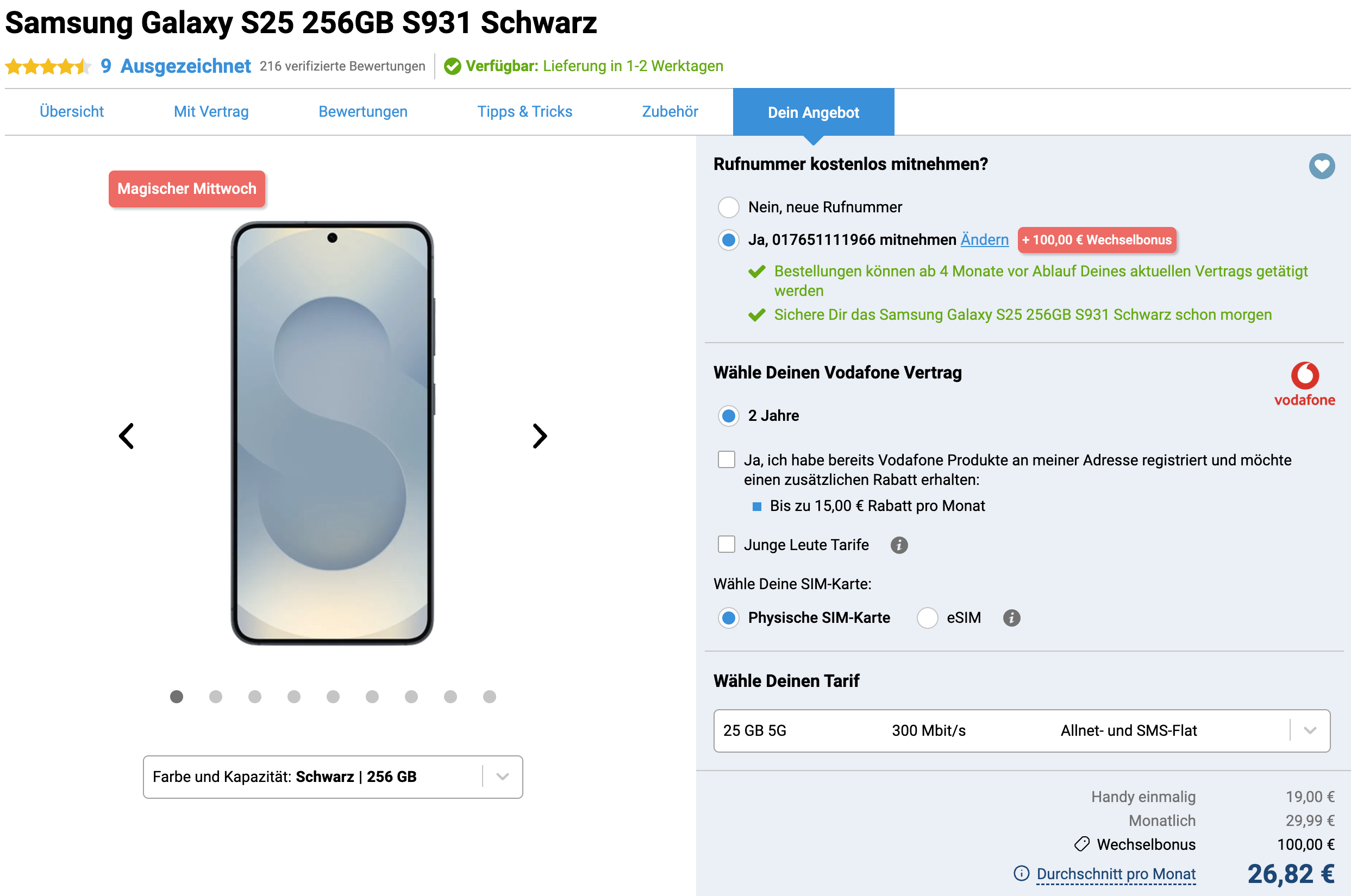Ihr bezahlt für den 25GB Vodafone-Vertrag also rechnerisch nur 0,99€ pro Monat, nachdem ihr den Wert des Smartphones abgezogen habt.