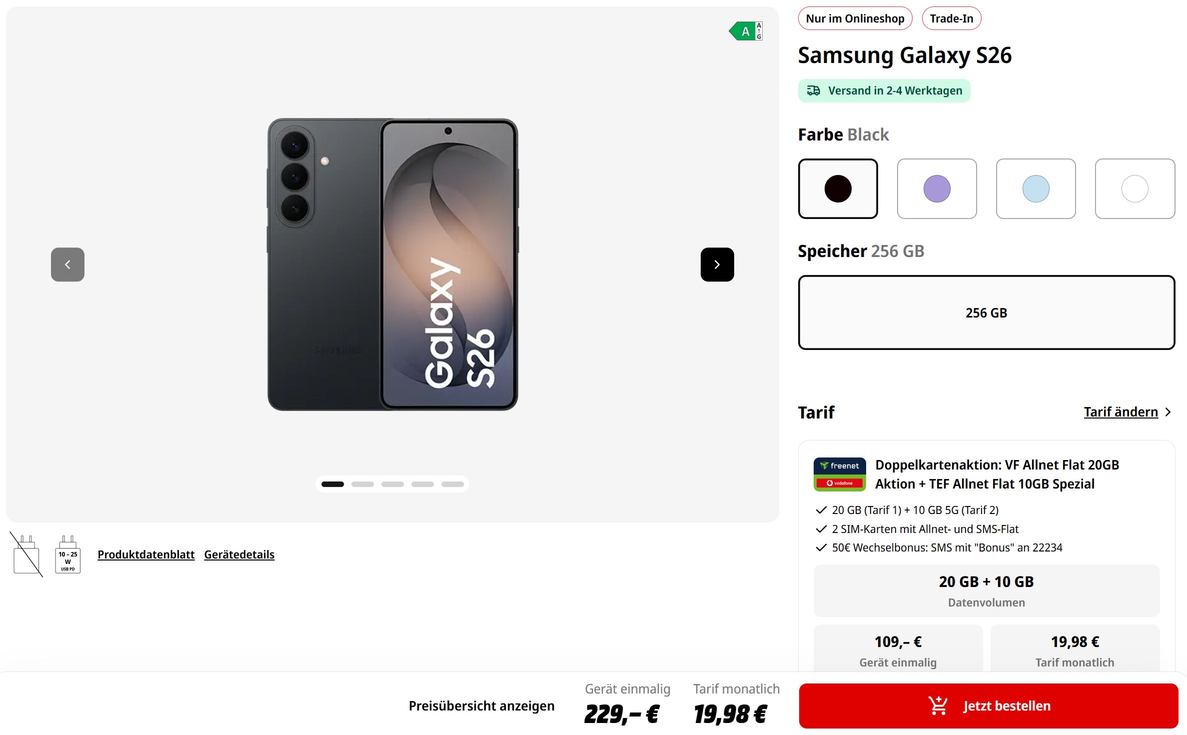 Das Samsung Galaxy S26 kommt mit 12/256GB Speicher und alle vier Farben stehen zur Wahl. Vertragspartner ist bei beiden Tarifen Freenet. Ihr erhaltet hier eine erstklassige Kombination: Der Haupttarif versorgt euch mit 20GB im Netz von Vodafone bei einer Geschwindigkeit von bis zu 50Mbit/s. Der Tarif kommt mit einer eSIM, aber eine physische SIM-Karte kann im Nachgang bei Freenet bestellt werden.