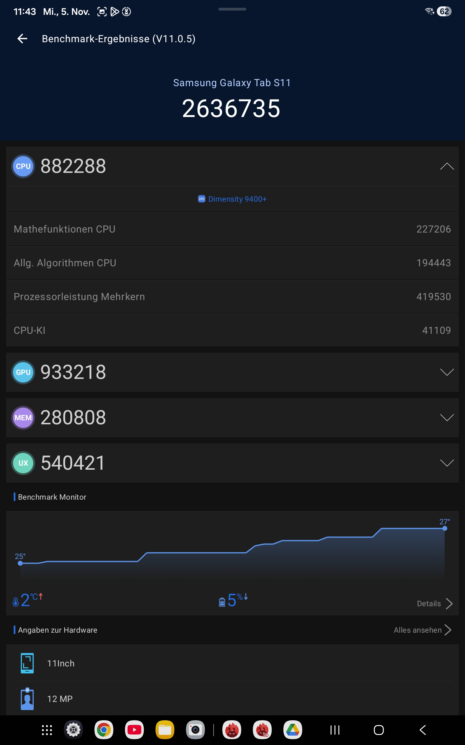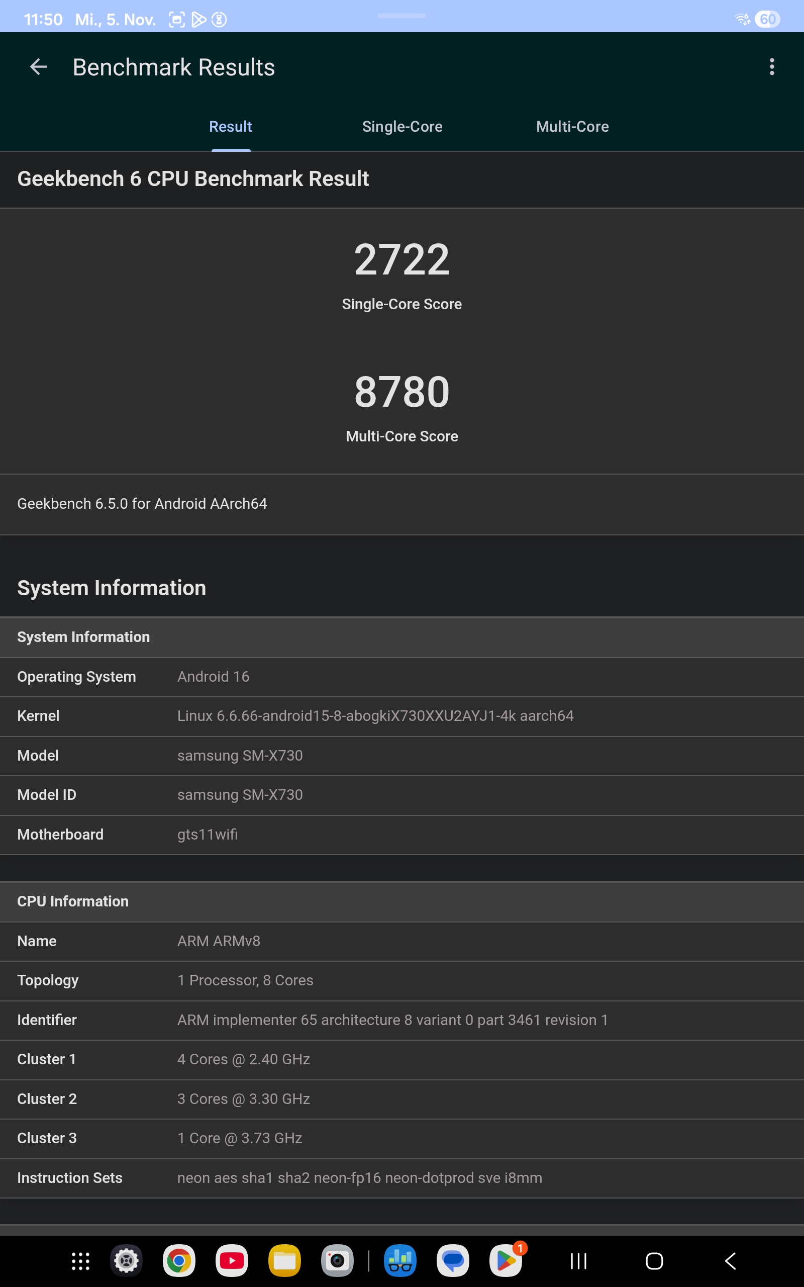 Im Inneren des Tab S11 kommt der MediaTek Dimensity 9400+ zum Einsatz. Der in 3 Nanometern gefertigte Octa-Core-Prozessor (1 x Cortex-X925 @ 3,73GHz, 3 x Cortex-X4 @ 3,30GHz, 4 x Cortex-A720 @ 2,40GHz) wird von einer Immortalis-G925-GPU unterstützt. Unabhängig von der Speicherversion sind stets 12GB LPDDR5X-Arbeitsspeicher verbaut.