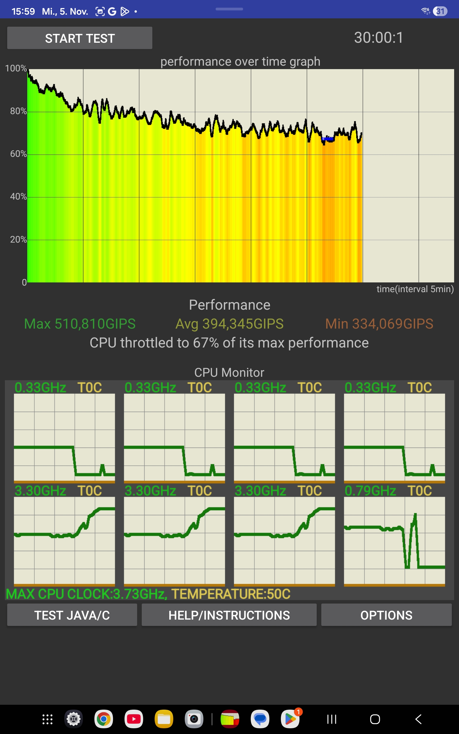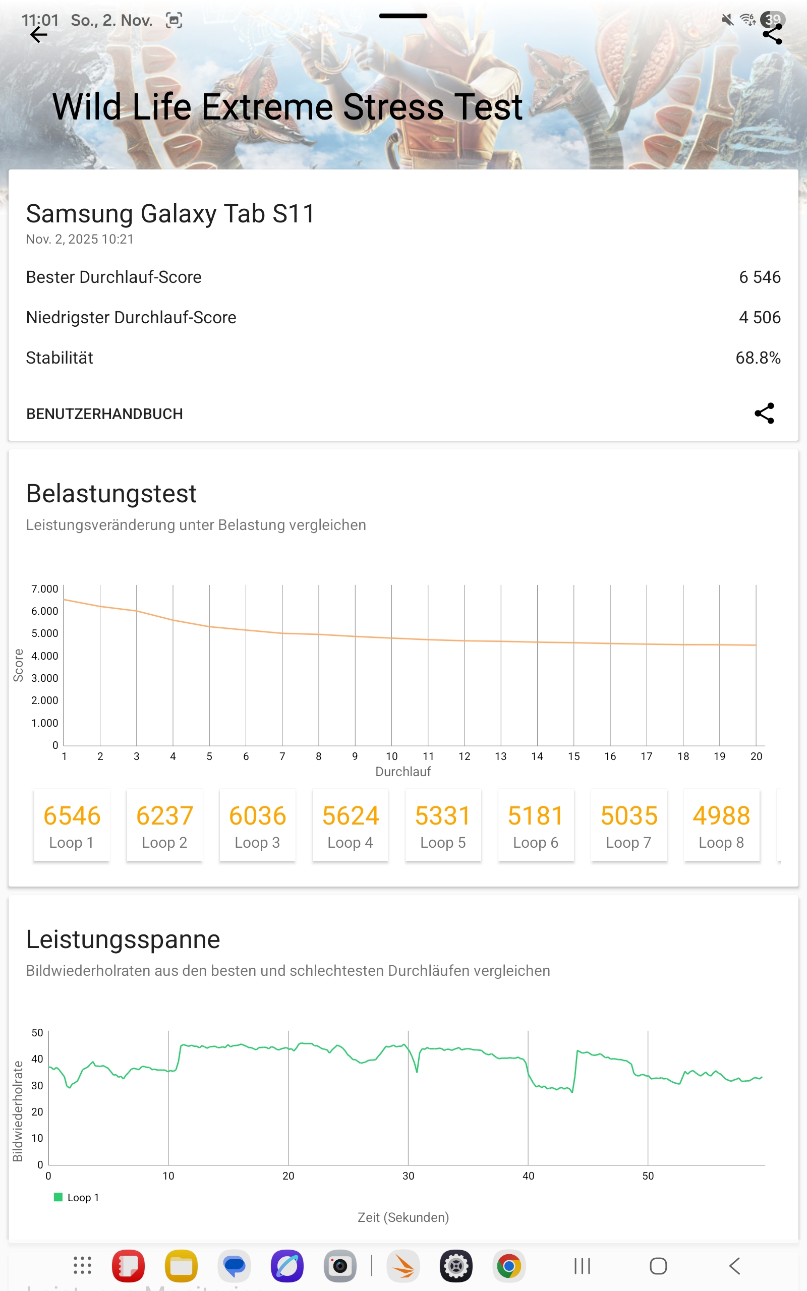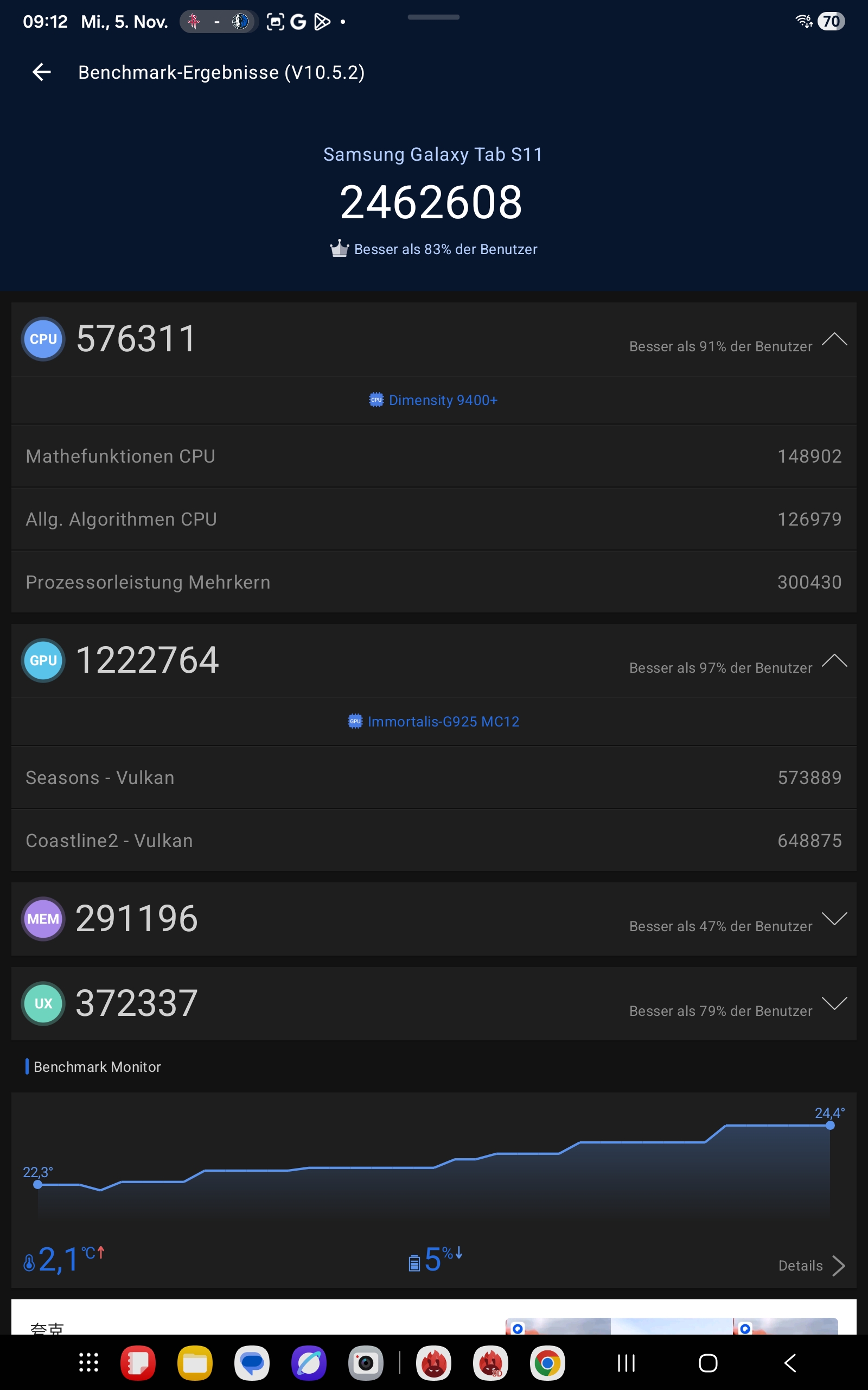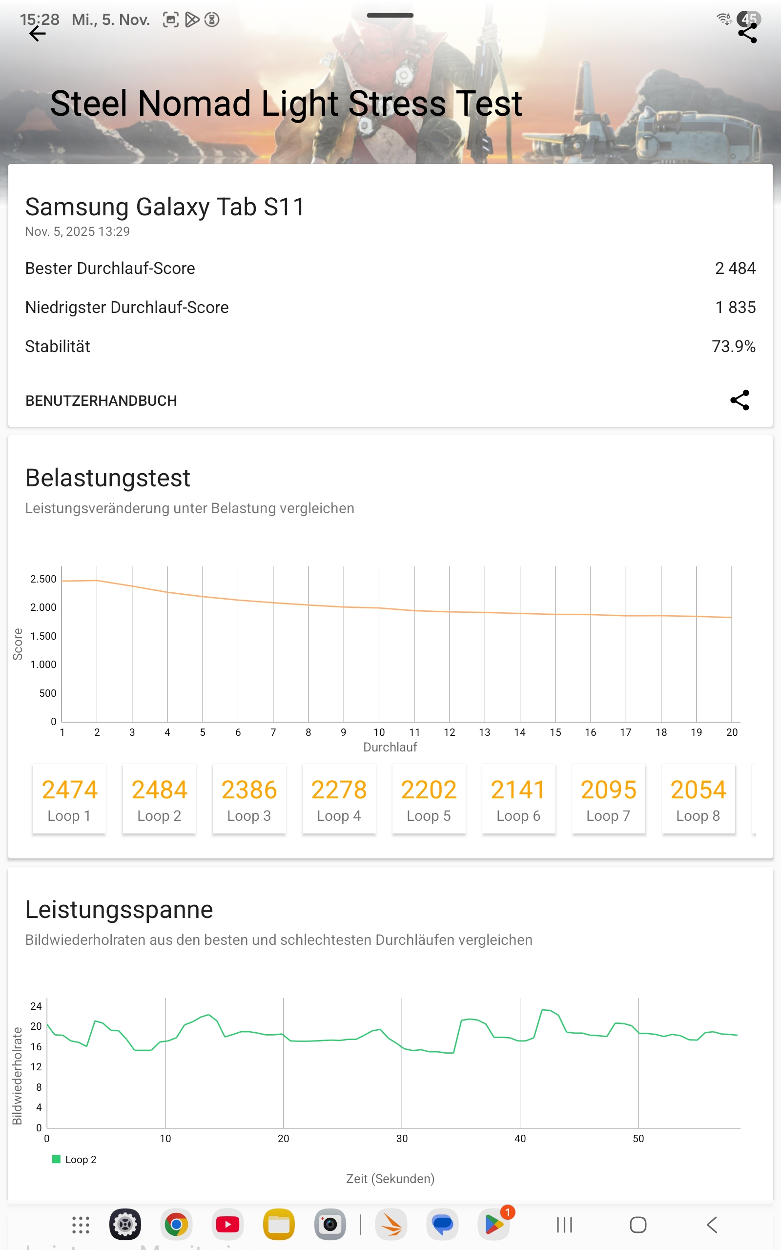 Die Leistung im Alltag ist über jeden Zweifel erhaben. Apps starten verzögerungsfrei, Multitasking funktioniert reibungslos und das System läuft butterweich. In Benchmarks positioniert sich das Tablet in der absoluten Oberklasse, bei der reinen Grafikleistung muss es sich jedoch den M-Chips von Apple oder dem Snapdragon 8 Elite (zum Beispiel im OnePlus Pad 3 – zum Test) geschlagen geben.