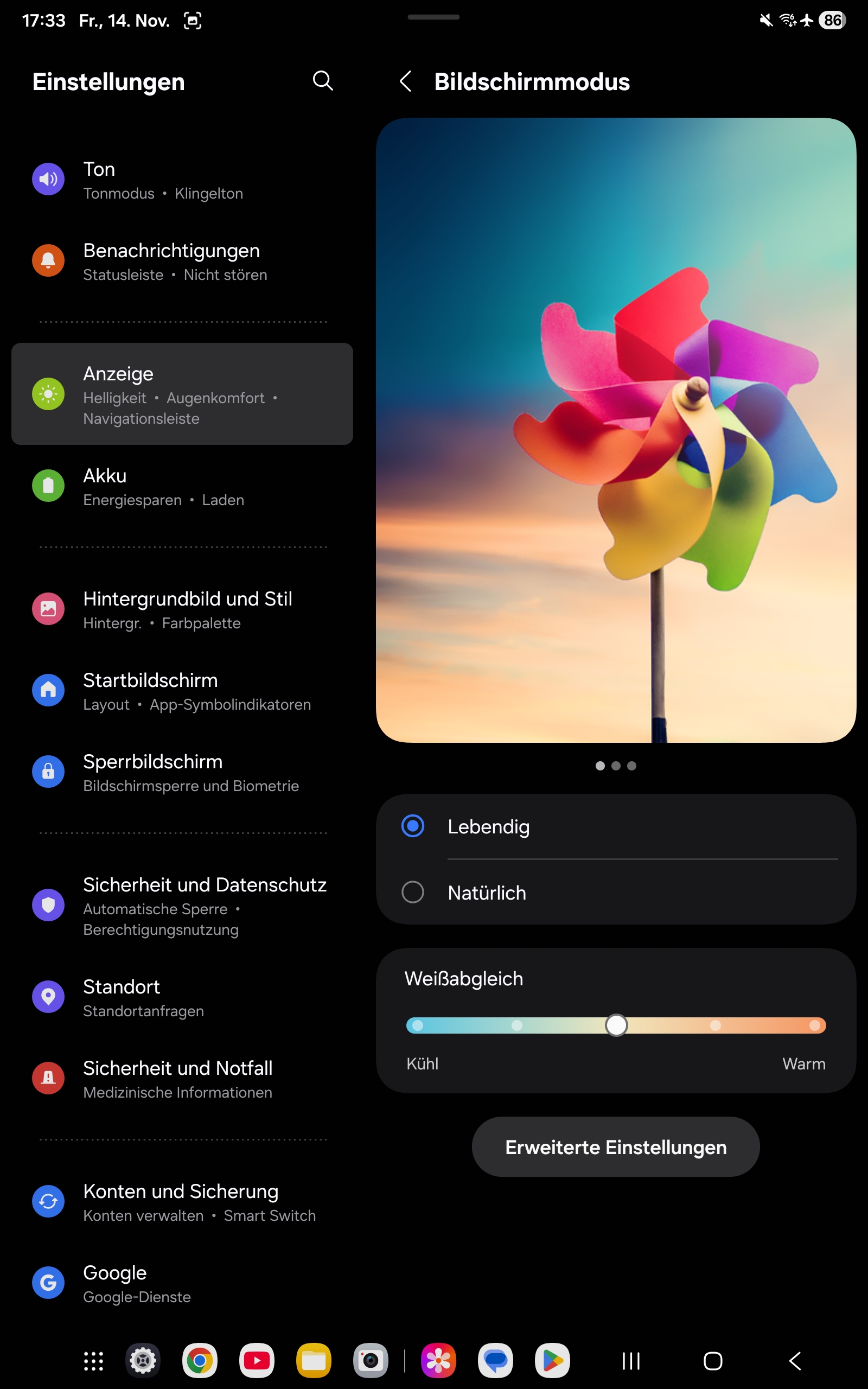Bei der Farbdarstellung hat OLED dann unbestreitbare Vorteile. Dank der AMOLED-Technologie sind die Schwarzwerte perfekt, die Kontraste unendlich und die Farben (im Modus „Lebendig”) extrem kräftig. Der Bildschirmfarbmodus kann auf „Lebendig“ oder „Natürlich“ festgelegt und der Weißabgleich frei angepasst werden. Für die HDR-Wiedergabe wird HDR10+ unterstützt. Netflix streamt ihr in Full-HD und auch HDR wird unterstützt. Zur Steuerung der Helligkeit nutzt Samsung allerdings Pulsweitenmodulation (PWM) mit einer Frequenz von nur 480Hz. Das könnte empfindliche Nutzer stören.