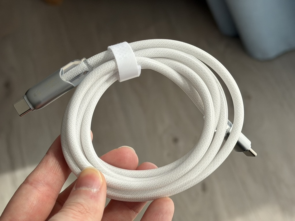 Das Kabel wird ab Werk mit einem integrierten, entfernbaren Lightning-Adapter geliefert. Die Kabellänge beträgt 1,5 Meter und das Gewicht liegt bei 60 Gramm.