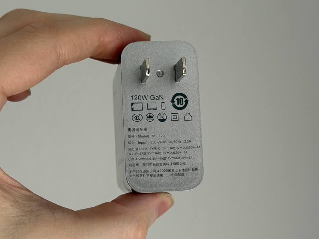 Das 120W-Ladegerät bietet zwar zwei Ports (USB-A und USB-C), jedoch kann jeweils nur ein Port gleichzeitig genutzt werden. Im Lieferumfang liegen passende 6-Ampere-Kabel für beide Steckertypen bei. Das Ladegerät liegt nicht in einer nativen EU-Version vor, weshalb ihr auf einen externen Adapter zurückgreifen müsst, der ebenfalls beiliegt.