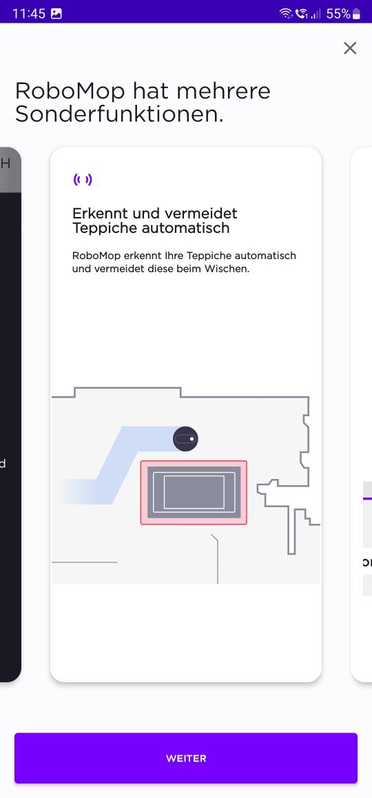| NeverStuck | Aktives Anheben des “Hinterteils” zur Überwindung von Hindernissen und Bodenschwellen (aktiv auch bei Teppichen beim Wischen). |