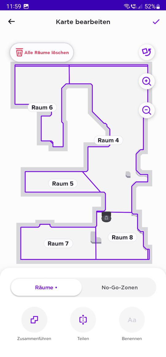 Wie üblich ist für die ordnungsgemäße Nutzung des Saugroboters eine dazugehörige App des Herstellers erforderlich. Die SharkClean-App kann aus dem Apple App Store bzw. dem Google Play Store heruntergeladen werden. Dafür kann auch ganz einfach der QR-Code auf dem Saugroboter gescannt werden. Vor der Nutzung der Applikation muss selbstverständlich eine entsprechende Registrierung durch den Nutzer erfolgen. Die Ersteinrichtung ist schnell und unkompliziert. Leider unterstützt die App ausschließlich 2,4-GHz-Netzwerke. Wie üblich muss vor der ersten Reinigung zunächst die Kartierung erfolgen. Hierzu fährt der Roboter die komplette Wohnung ab, ohne zu reinigen, und erstellt nach Abschluss eine Karte. Meine 44 m² große Wohnung wurde innerhalb von sieben Minuten kartografiert. Anschließend kann man die Räume teilen oder zusammenführen, sie umbenennen oder No-Go-Zonen einrichten. Leider ist es nicht möglich, eine weitere Karte parallel zu erstellen. Haushalte mit mehreren Etagen haben somit das Nachsehen.