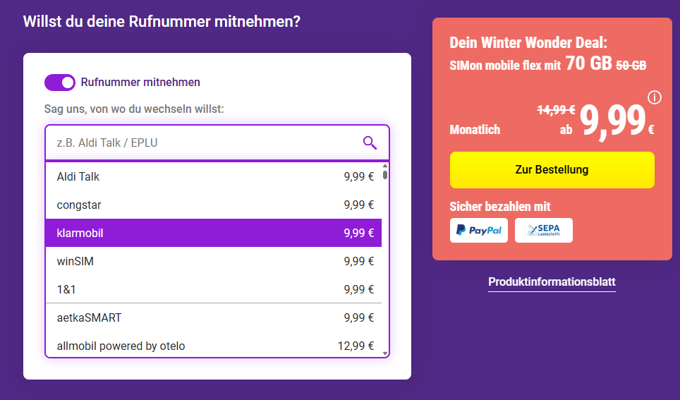 Die Rufnummermitnahme ist natürlich kostenlos, aber bei SIMon Mobile sogar Vorraussetzung für den günstigen monatlichen Preis. Braucht ihr eine neue Runummer, dann kostet der 70GB-Tarif monatlich 3€ mehr.