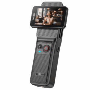 Doch die Sjcam C400 ist wandelbar. Im Lieferumfang befindet sich auch ein Griffstück, das 143,5 x 38,5 x 38,5 Millimeter misst. Zusammen mit der Kamera wiegt das Konstrukt schließlich 189 Gramm und damit etwa so viel wie ein leichtes Smartphone. Es bleibt also handlich. Verbunden werden die beiden Teile über einen USB-C-Anschluss an der Kamera, das Gegenstück befindet sich an der Spitze des Griffstücks. So verbunden liegt der Bildschirm der Kamera auf der vom Nutzer abgewandten Seite. Stattdessen steht jetzt jedoch ein 90 Grad drehbarer 2,29 Zoll Touchscreen am Griff zur Verfügung. Über diesen gestaltet sich die Touchsteuerung zugegebenermaßen deutlich einfacher. Am Griff selbst gibt es nun zwei Knöpfe, einen Power-Button und einen Aufnahmeknopf. An den Flanken befinden sich zwei Spannknöpfe, die gleichzeitig gedrückt werden müssen, um die Kamera wieder aus dem Griffstück zu befreien.