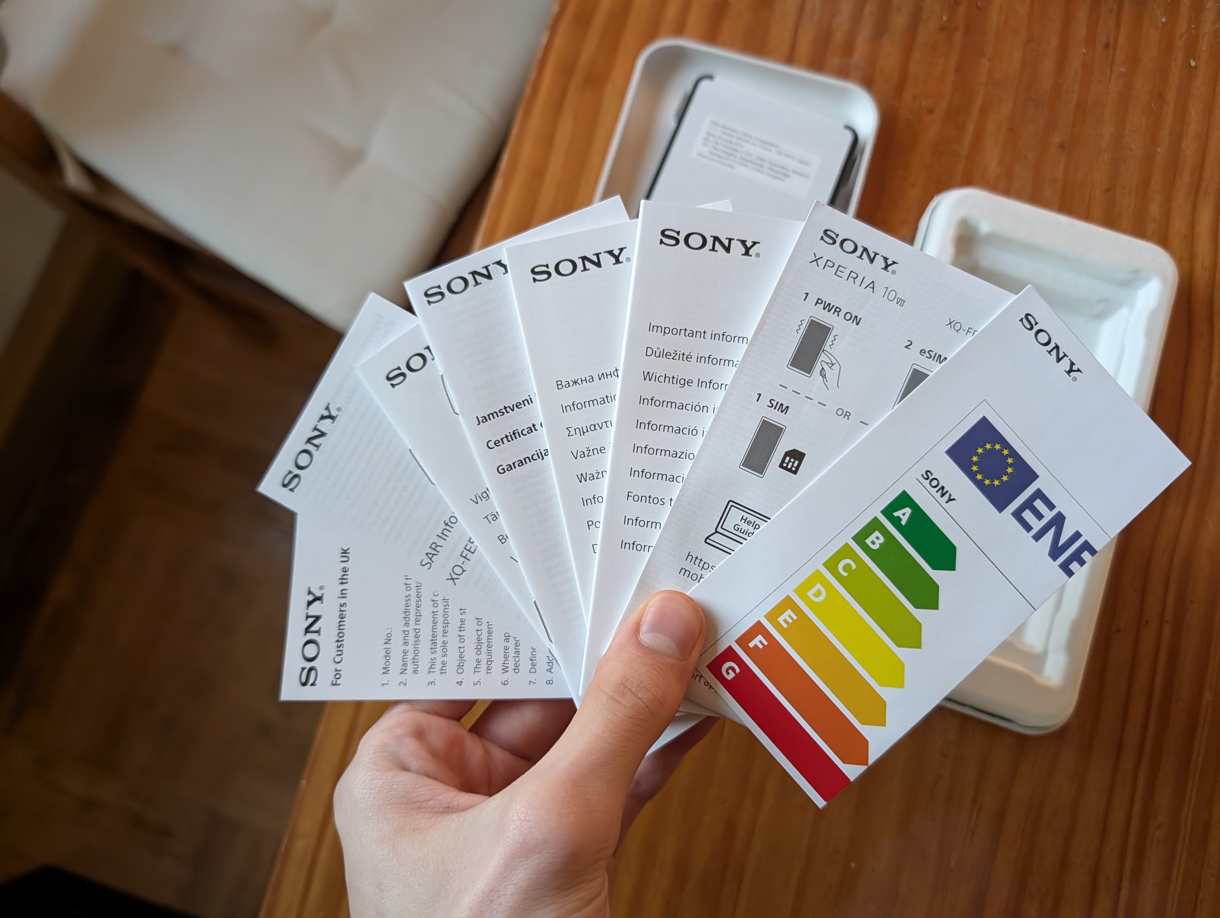 An diesem Punkt muss man die Japaner beinahe schon als Vorreiter bezeichnen, weil sie seit einigen Jahren den Lieferumfang einfach komplett entfernt haben. Die schlichte Verpackung beherbergt das Smartphone und unnötig viel Papierkram, aber kein Netzteil und nicht einmal ein Kabel.