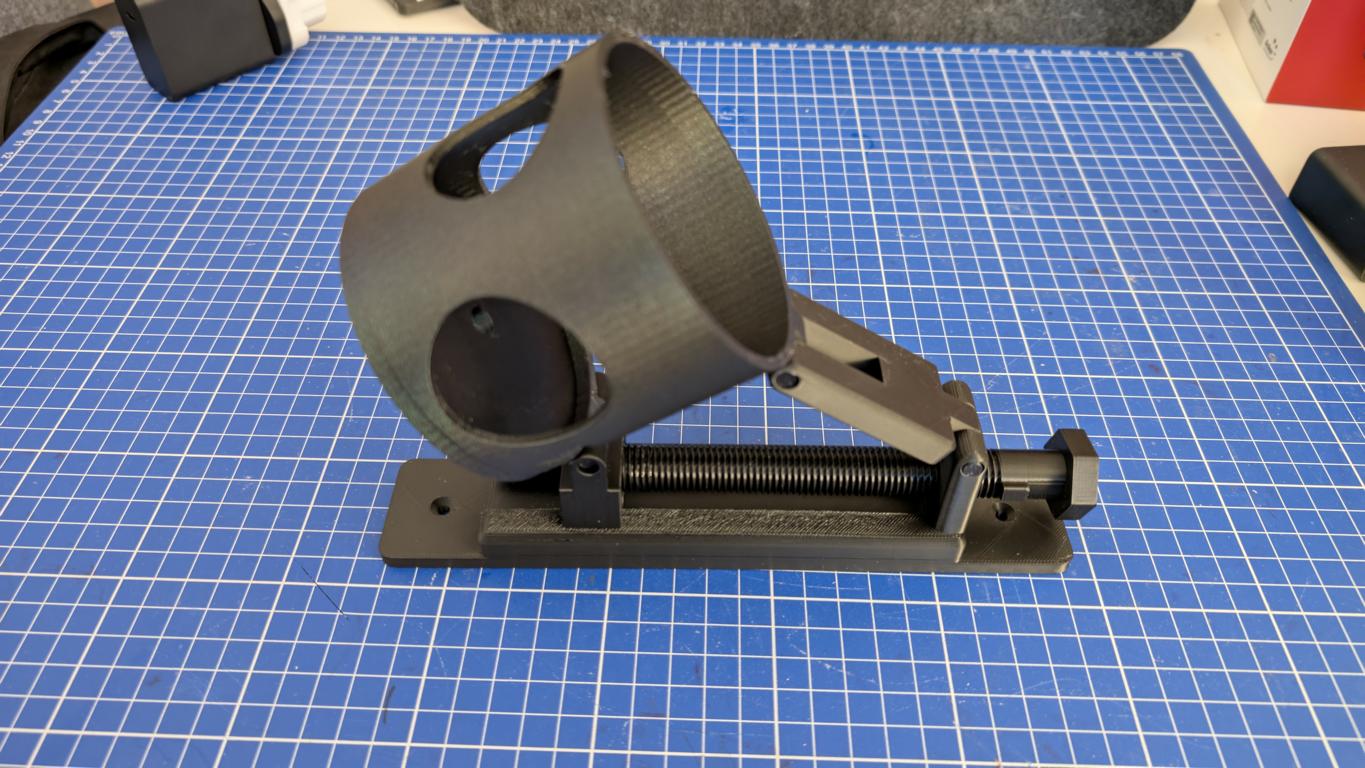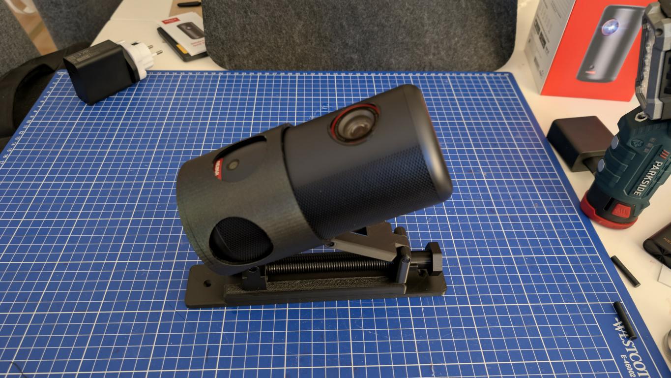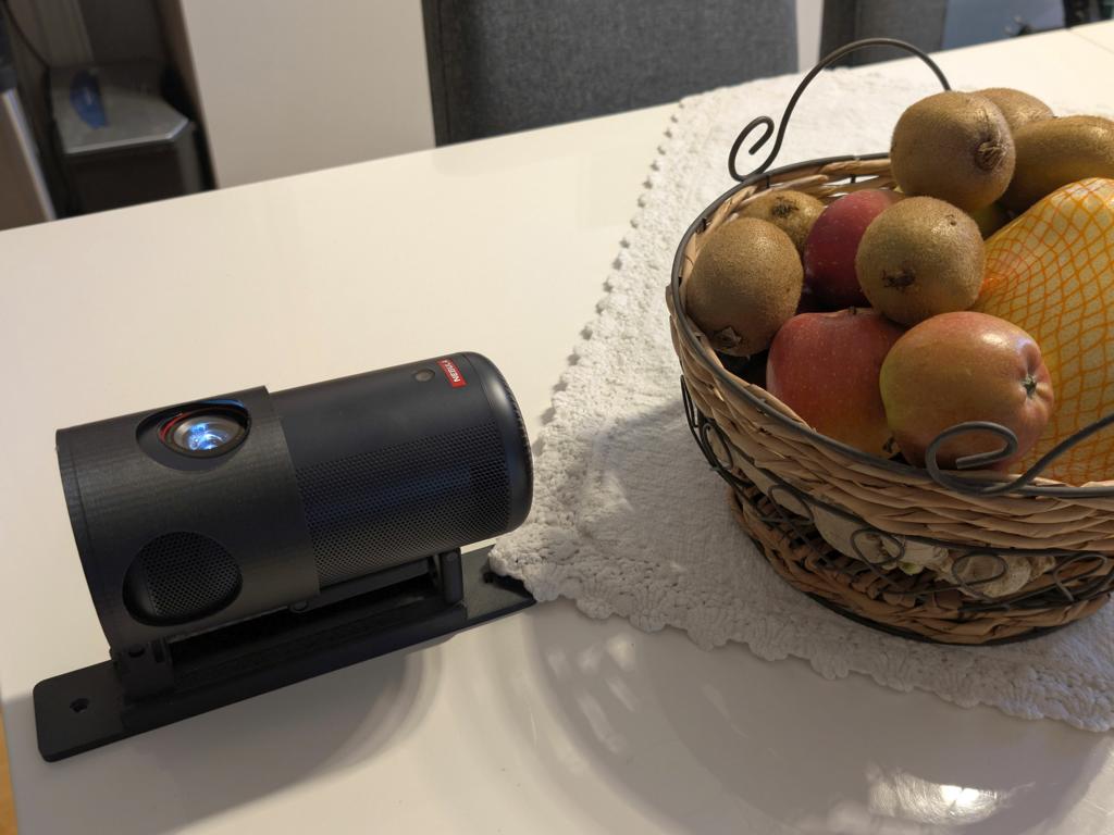Zur Projektion an die Schlafzimmerdecke nutze ich eine selbst weiterentwickelte, 3D-gedruckte Halterung. Das im Eigenbau entstandene Zubehör kommt im Alltag tatsächlich zum Einsatz. Die Konstruktion erlaubt eine stufenlose Einstellung der Neigung und sorgt für eine stabile Positionierung des Projektors auf einer ebenen Fläche. Dadurch lässt sich das Bild gezielt an die Decke ausrichten, ohne dass provisorische Unterlagen verwendet werden müssen. Diese Lösung erweitert die Einsatzmöglichkeiten des Capsule 3 sinnvoll.