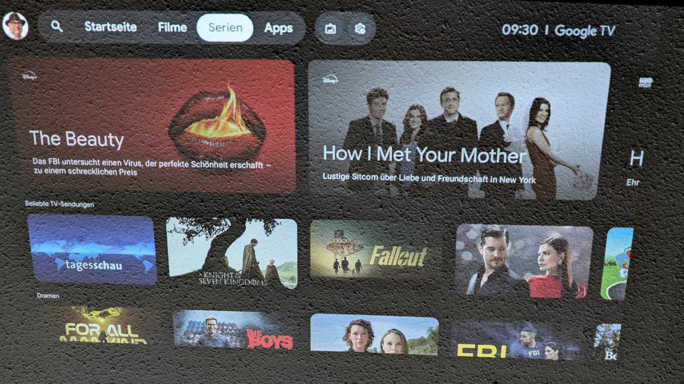 Das Betriebssystem basiert auf Google TV und bietet damit eine vollständige Android-TV-Umgebung mit Zugriff auf den Google Play Store. Die Oberfläche ist klar strukturiert und in Themenbereiche wie Startseite, Apps und Einstellungen gegliedert. Inhalte aggregiert das System plattformübergreifend, sofern ihr entsprechende Konten hinterlegt.