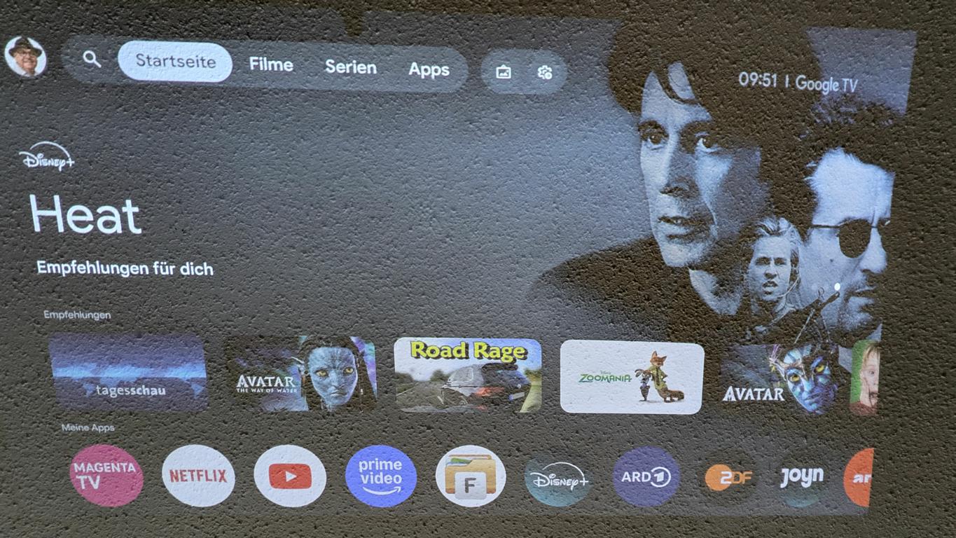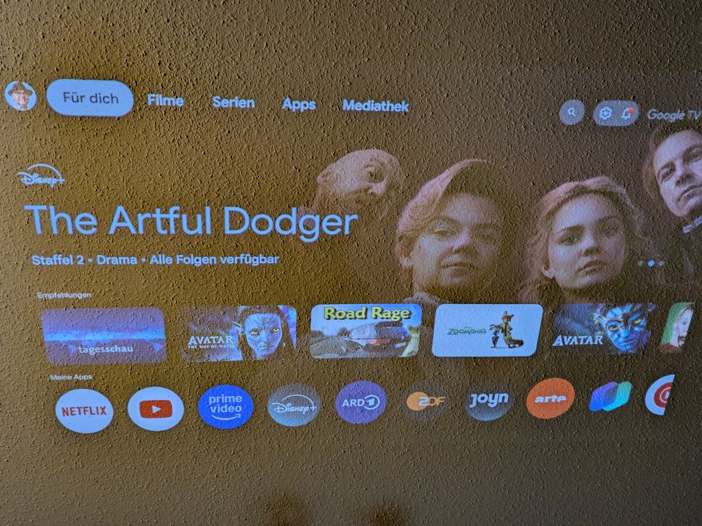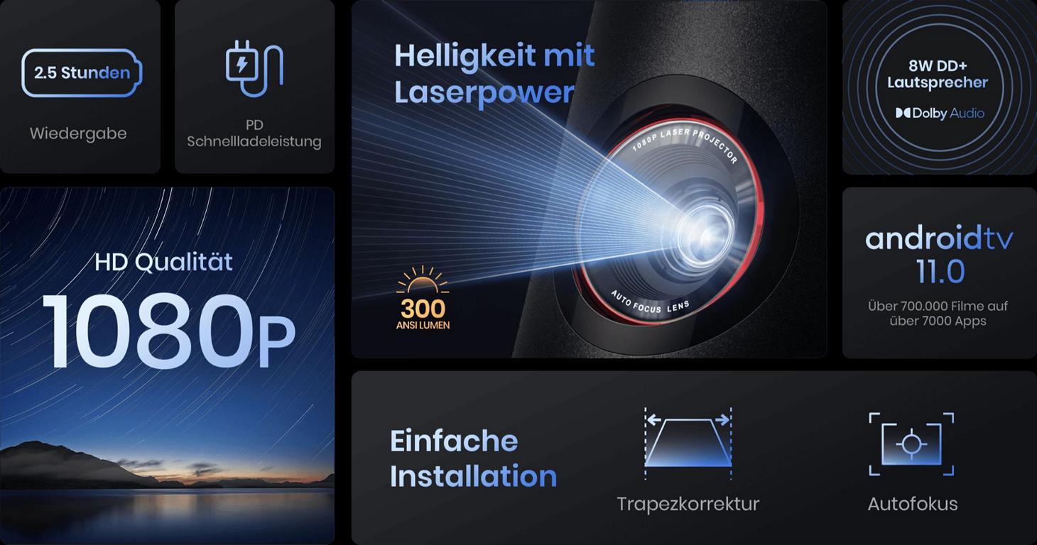 Der integrierte Akku macht euch deutlich flexibler. Autofokus und automatische Trapezkorrektur reduzieren euren Einrichtungsaufwand spürbar. Google TV ermöglicht euch den direkten Zugriff auf lizenzierte Streaming-Dienste ohne externe Zuspieler. Über den USB-A-Anschluss gebt ihr zusätzlich lokale Inhalte wieder.
