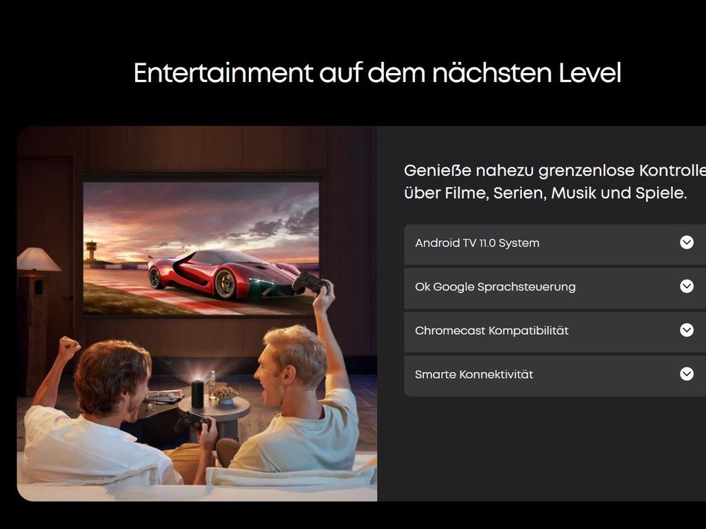 Chromecast ist integriert. Inhalte übertragt ihr direkt von kompatiblen Smartphones, Tablets oder Computern auf den Projektor. Auch Screen Mirroring wird unterstützt, abhängig vom verwendeten Endgerät. Die Einstellungen erlauben Anpassungen bei Bild, Ton, Netzwerk und Gerätekonfiguration. Firmware-Updates werden über das System verteilt und lassen sich direkt installieren.