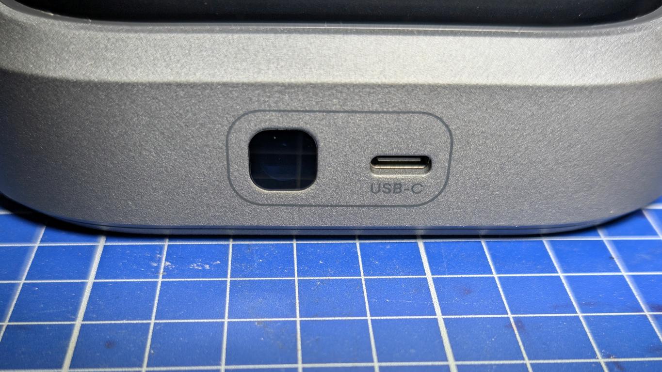 USB-C-Anschluss für die Stromversorgung sowie IR-Empfänger für die Fernbedienung sind am Fuß des Gerätes zu finden.