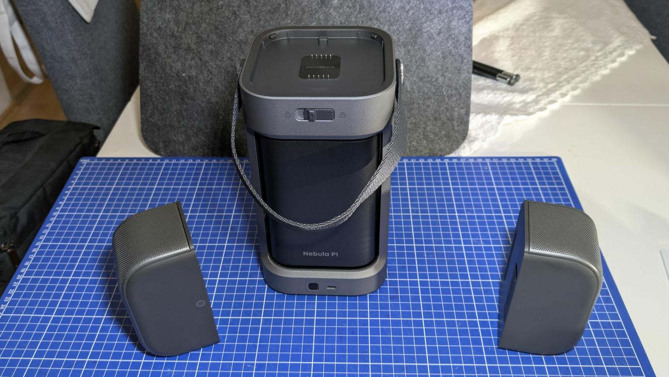 Der Nebula P1 setzt auf zwei abnehmbare 10-Watt-Lautsprecher. Zusammen liefern sie 20 Watt im 2.0-Stereobetrieb. Die Lautsprecher lassen sich frei im Raum positionieren und verfügen über integrierte Akkus mit bis zu 20 Stunden Laufzeit.
