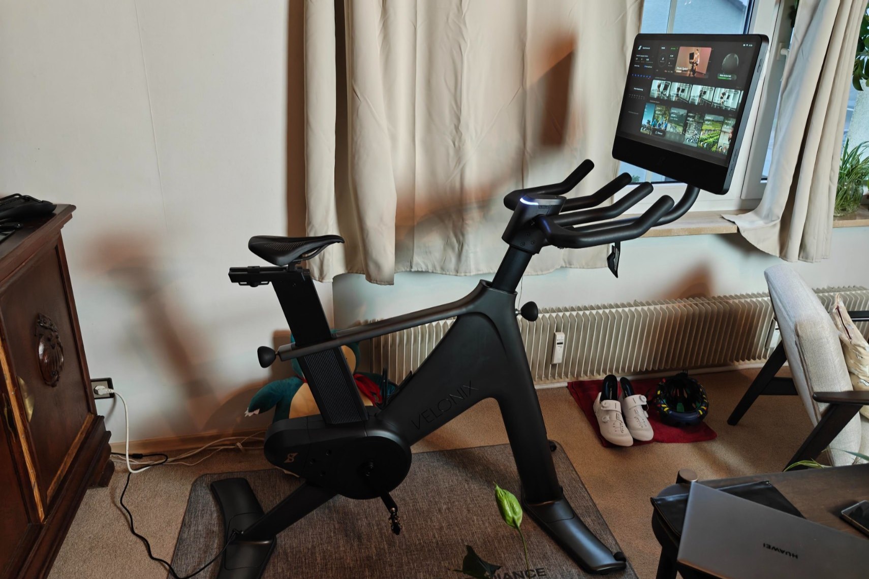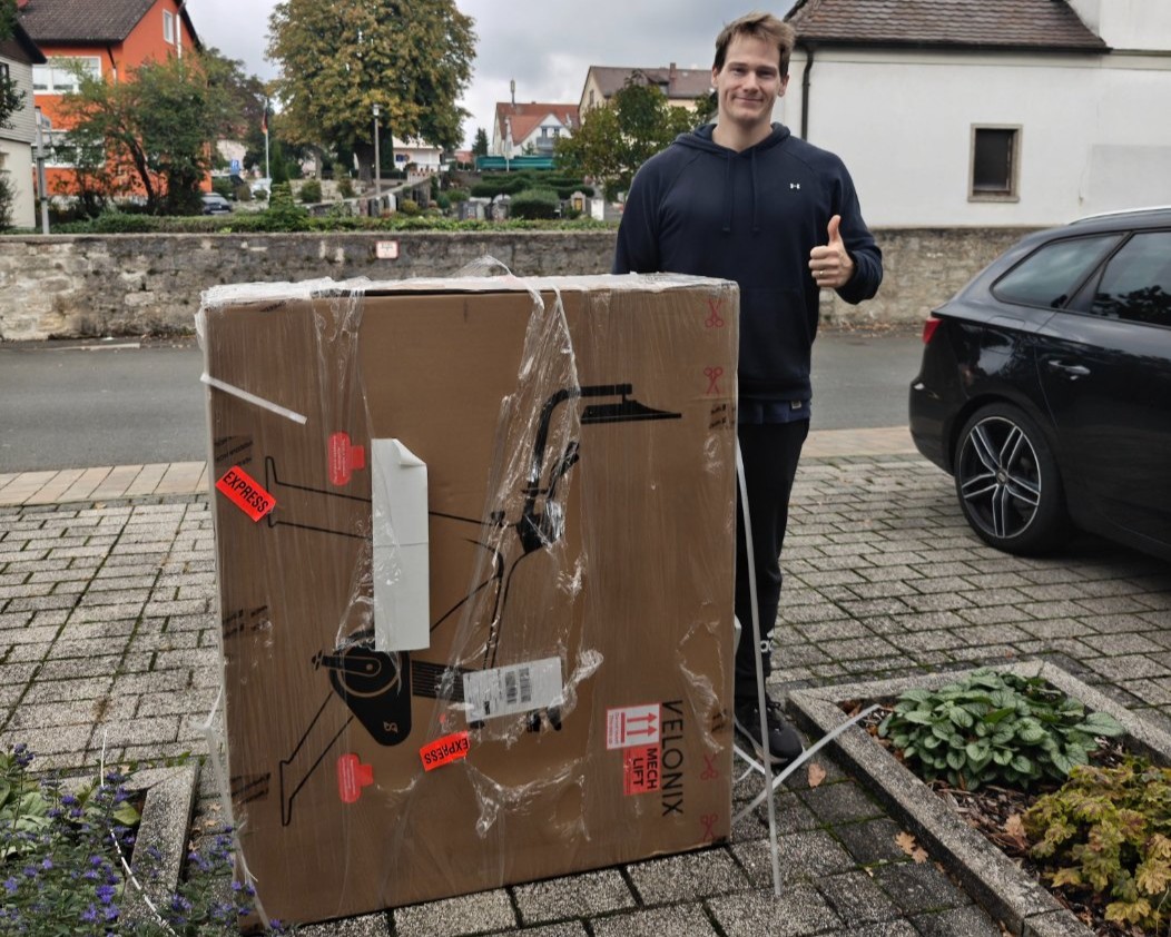 Das Speediance VeloNix kommt per Schwertransport (bei uns mit DHL) auf einer Palette vor die Haustür. Das Paket bringt 48 kg auf die Waage und ist ziemlich unhandlich. Um es in die Wohnung hochzutragen, braucht es eine weitere starke Person. Der eigentliche Aufbau ist in 30 Minuten erledigt und erfordert kein Mechaniker-Vorwissen. Die zwei Bodenplatten werden mit massiven Sechskantschrauben angeschraubt, der Vorbau und die Sattelstütze werden eingeschoben und das große 21-Zoll-Display wird mit einer Schraube am Gelenk gesichert. Vorn befinden sich zwei Rollen, sodass das VeloNix angekippt geschoben werden kann. Es braucht noch Strom: Das Netzkabel ist zweigeteilt; hier hätte der Wandler bereits im Gehäuse Platz finden können. Es stehen sowohl vorn als auch hinten ein DC-Eingang bereit. Schön: Alles Notwendige wird mitgeliefert – man braucht kein Werkzeug daheim, und auch eine gedämpfte Bodenschutzmatte liegt bei. Hier ist alles im Paket (bis auf Sportbekleidung), was es für das Training braucht.