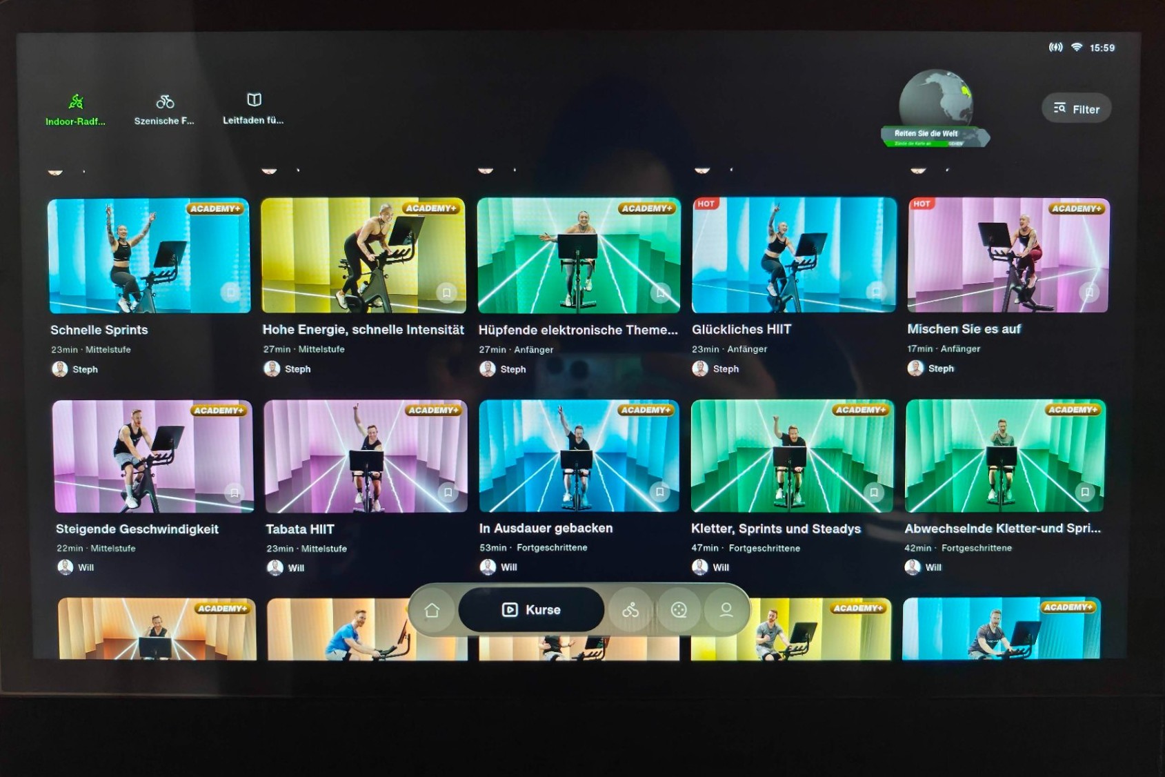 Kurse: Es gibt ein paar Kurse mit Trainer, um sich vom „Drill-Instruktor“ antreiben zu lassen. Allerdings sind davon einige hinter der Paywall „Academy+“ verborgen. Live-Kurse, wo man sich einen Platz buchen kann, sind wohl vorgesehen, aber Termine werden derzeit nicht angeboten.