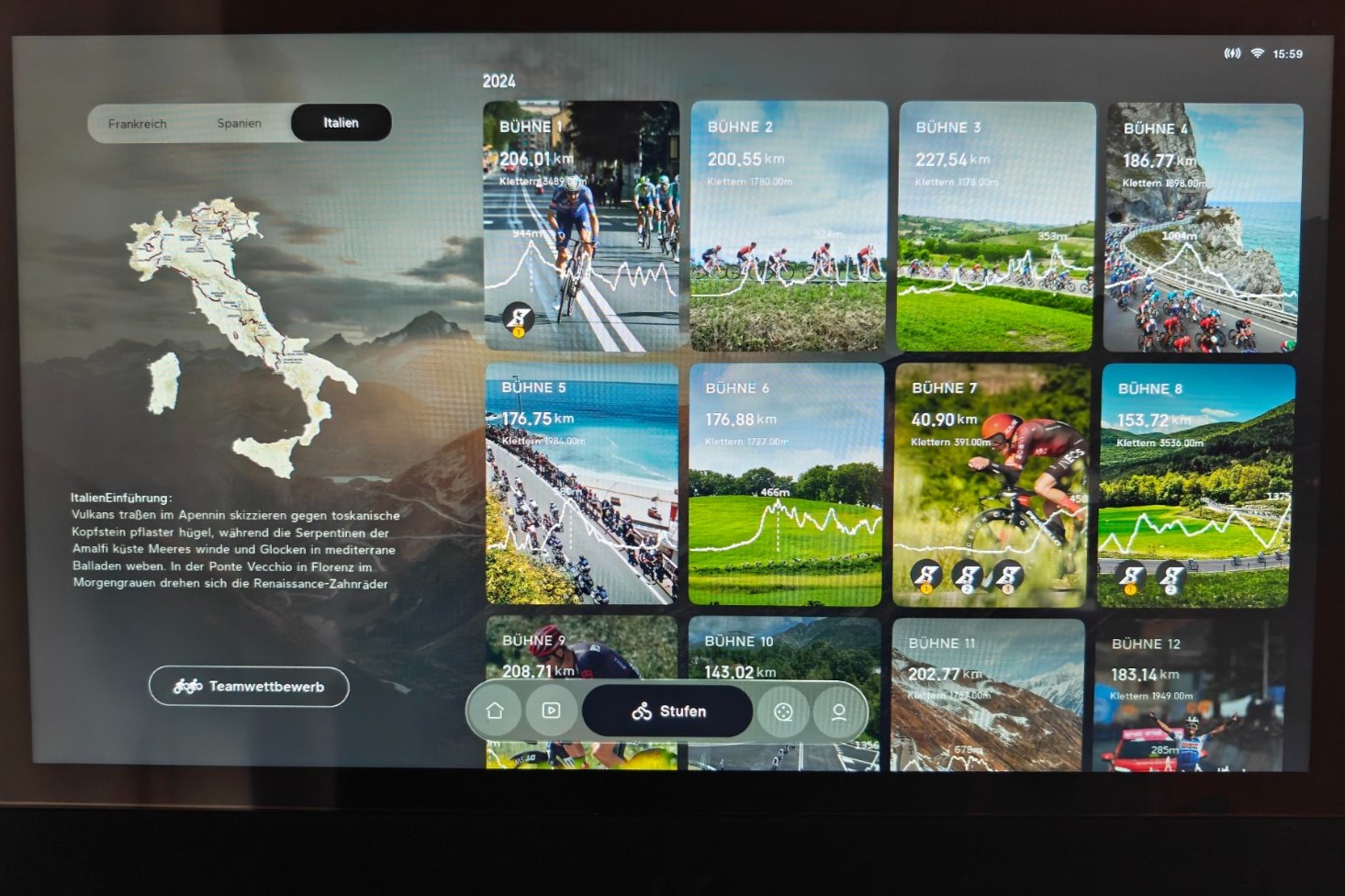 Stufen: Anspruchsvoller werden die „Stufen“, wo sich bekannte Wettbewerbe wie der Giro d’Italia oder die Tour de France nachfahren lassen. Hier finden sich auch „szenische Fahrten“, die richtig cool sind. Über die Weltkarte wählt man einfach das Land der Wahl aus (z. B. eine Tour durch das Saarland in Deutschland) und fährt eine echte Strecke. Leider befinden sich auch hier ein paar hinter der Paywall.