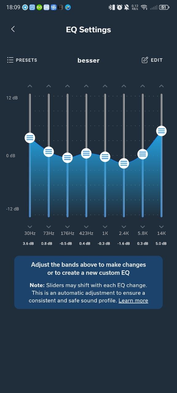 Versucht ihr jetzt, euer eigenes Profil zu erstellen, hat sich Status Audio überlegt, dass sich alle Regler auf Basis der getroffenen Einstellung anpassen beziehungsweise normalisieren. Das soll verhindern, dass ihr zu viel Gain einstellt und die Kopfhörer das nicht abbilden können oder Störgeräusche verursachen. Ihr werdet also an die Hand genommen. Das ist keine schlechte Idee. Aber die Funktion lässt sich nicht deaktivieren. Dadurch ist eine feine Einstellung nicht möglich, da ständig die anderen Bänder in den negativen Bereich rutschen, die ihr vielleicht nur leicht angehoben hattet.