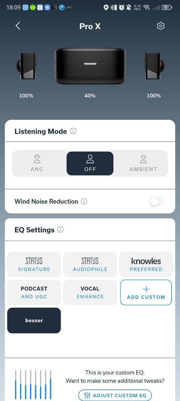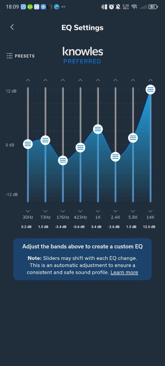 Und damit kommen wir zum Equalizer. Oh Boy. Neben „Status Signature“ und „Status Audiophil“ gibt es noch das Profil „Knowles Prefered“ und zwei Profile, um Stimmen hervorzuheben, etwa für Podcasts. Nun, der Vorteil von all dem ist: Ihr könnt über den „Custom Equalizer“ sehen, welche Einstellungen für die einzelnen Profile getroffen wurden. „Signature“ ist etwa genullt, „Audiophil“ hebt die Mitten an, während „Knowles Prefered“ einfach nur die Höhen auf Anschlag dreht. Das alles wirkt jedoch eher lieblos hingezimmert.