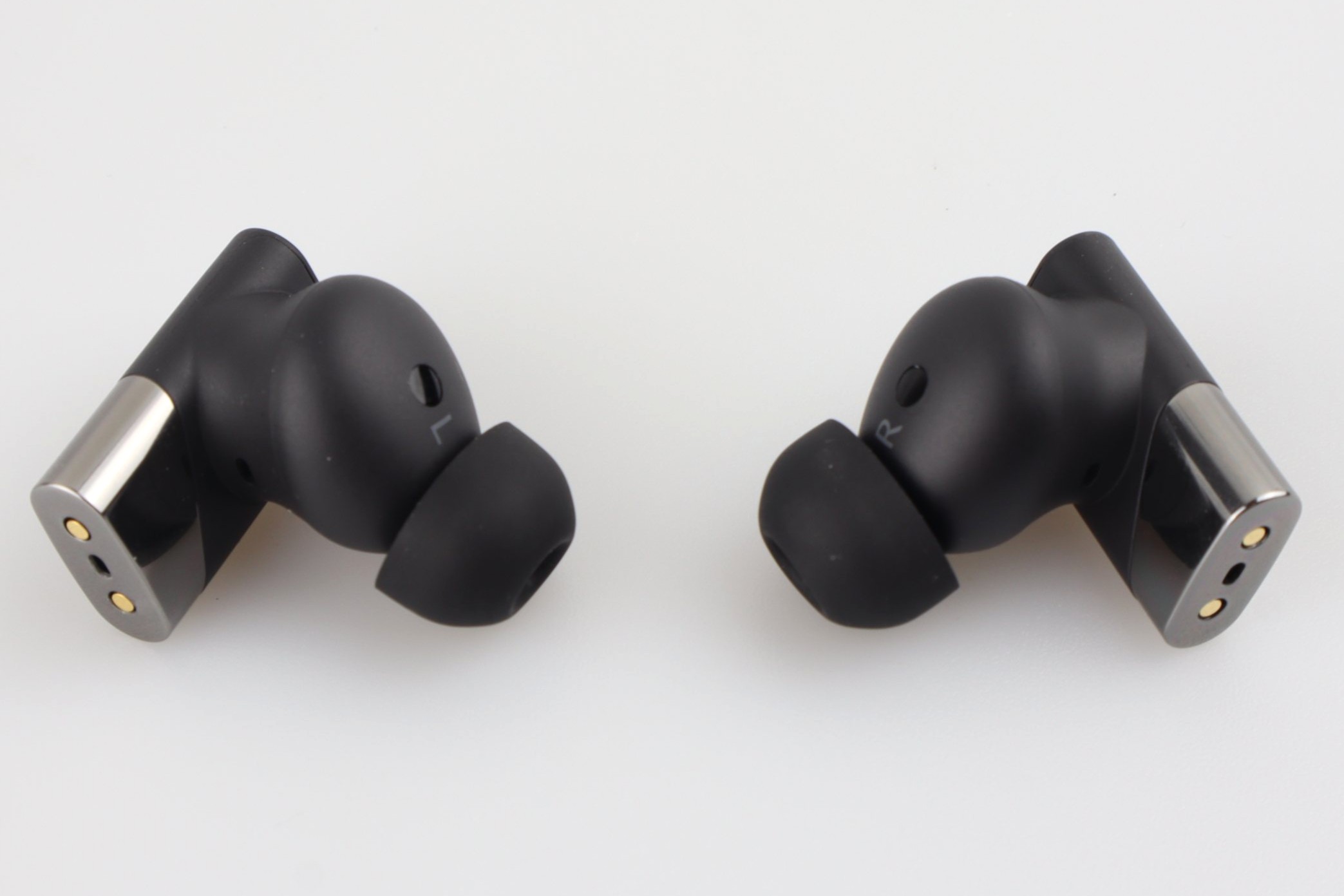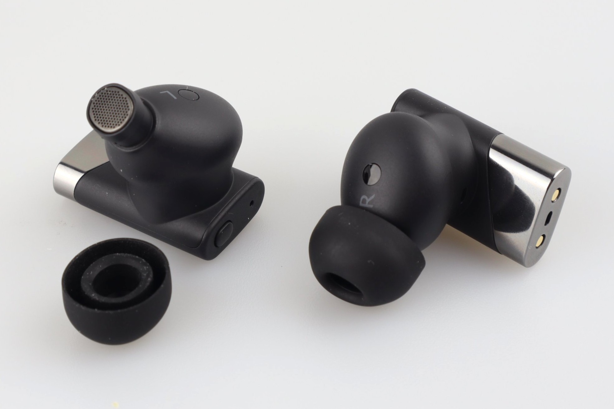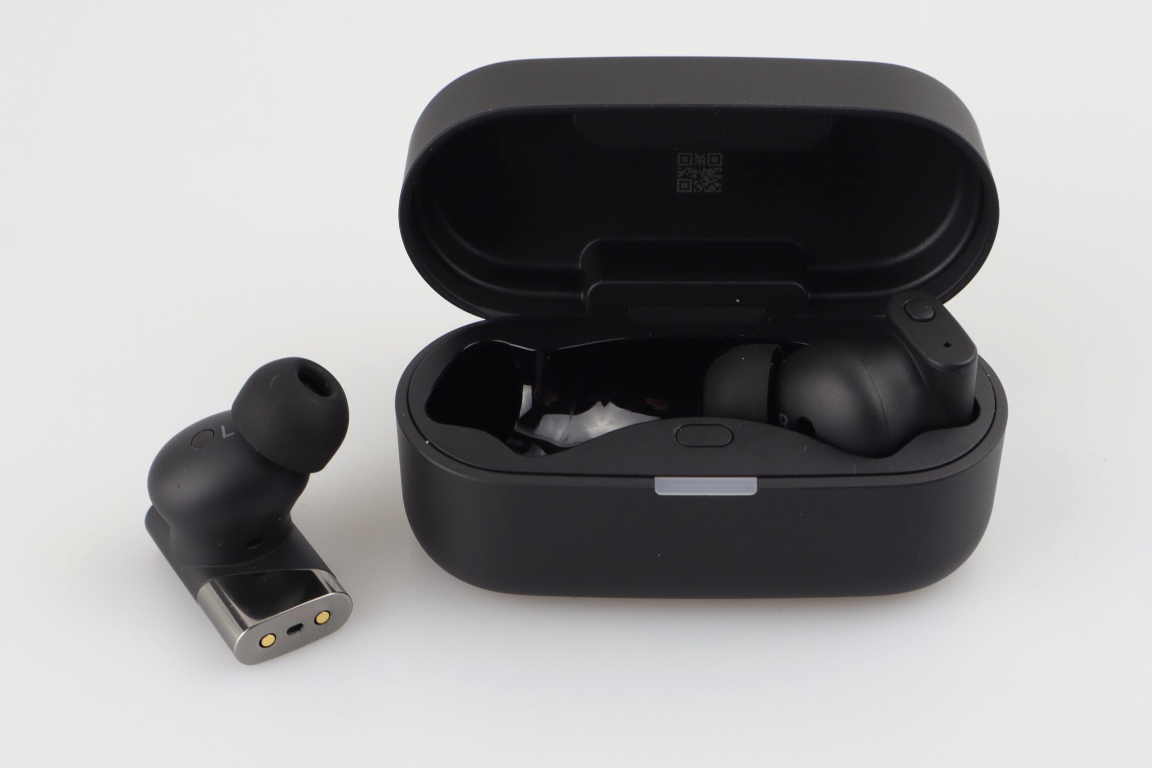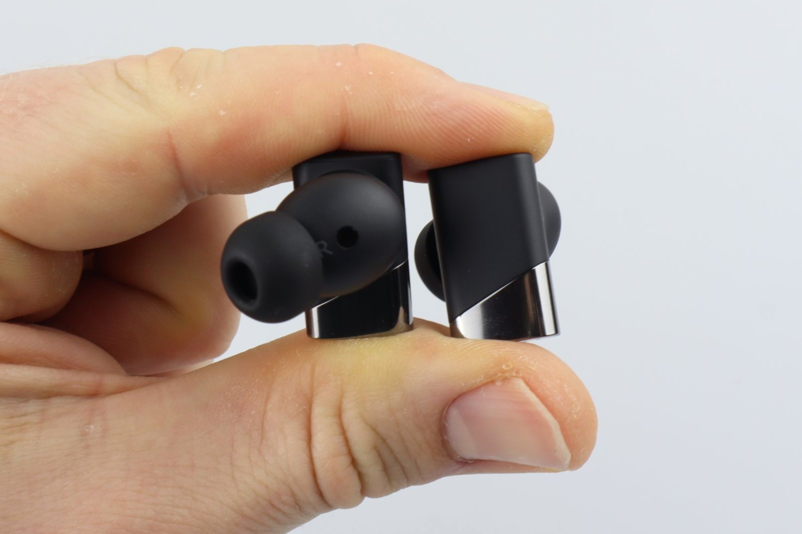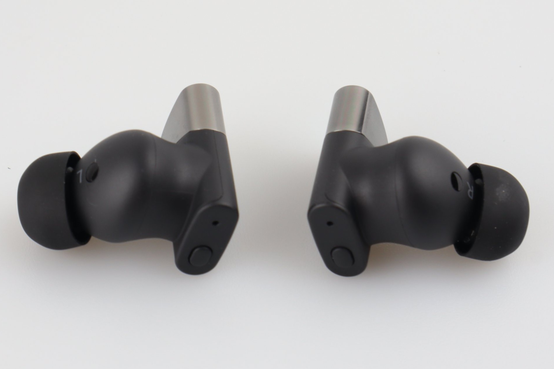 An der Innenseite liegt das Feld für den Näherungssensor. Der Lautsprecherausgang misst 6,5 x 6 Millimeter und fällt im Vergleich zu vielen anderen Earbuds also recht groß aus. Ein ordentliches Alugitter schützt den dahinterliegenden Treiber. Die mitgelieferten Stöpsel aus Gummi sind zwar an sich nichts Besonderes, sitzen aber so fest auf den Buds, dass ihr beim Abnehmen Vorsicht walten lassen müsst, sonst reißen sie.