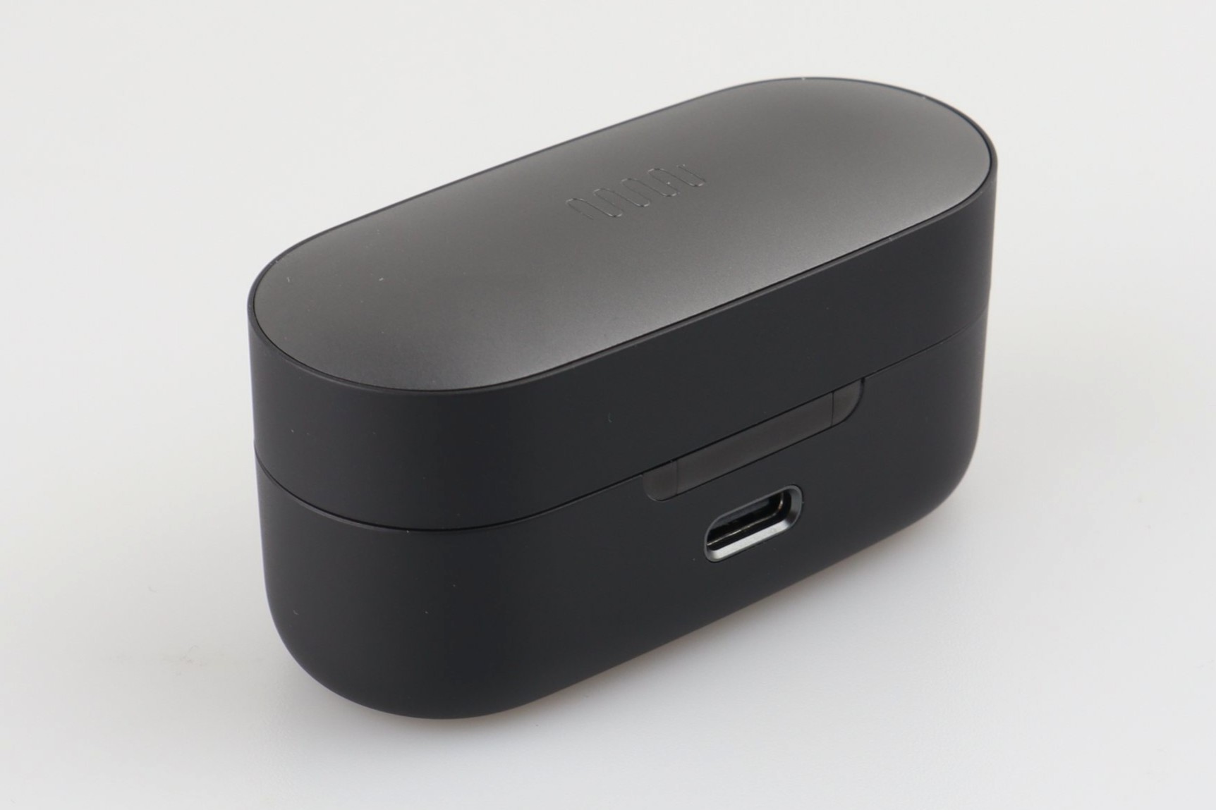 Ausnahmsweise darf die Station mal den optisch unspektakuläreren Part übernehmen. Das ovale Design ist nicht neu. Doch die Oberseite des Deckels besteht auch hier aus Aluminium. Darin eingraviert ist das Status-Audio-Logo, das allgemein eher unscheinbar auftritt. An der Front befindet sich eine große Status-LED; direkt dahinter, innenliegend, findet ihr beim Aufklappen den Pairing-Button. Ihr ladet das Case natürlich über einen USB-C-Anschluss auf der Rückseite. Ein Alu-Ring fasst diesen zusätzlich ein.