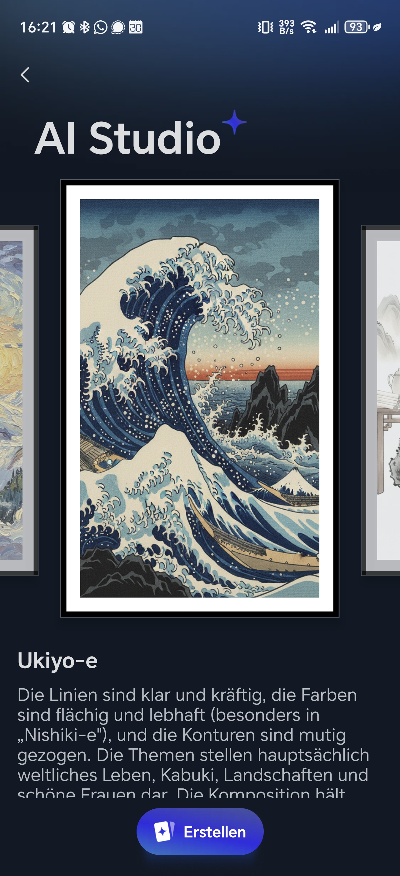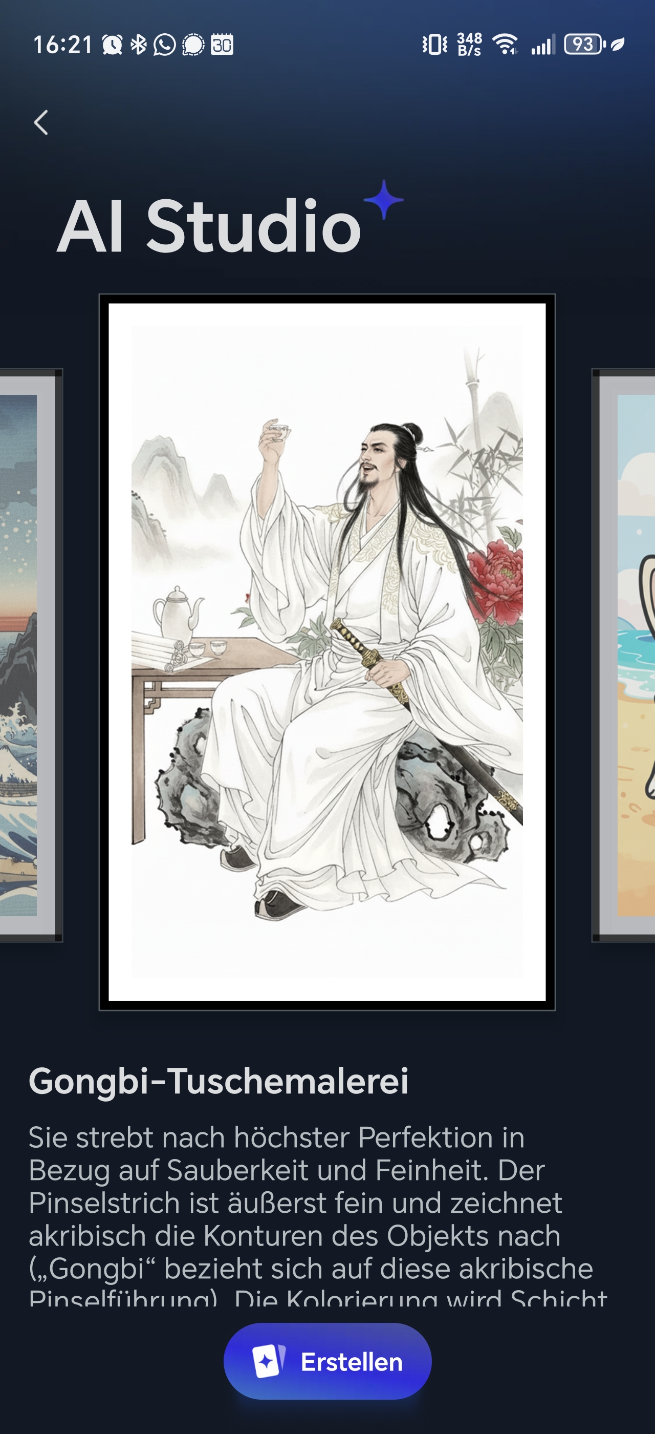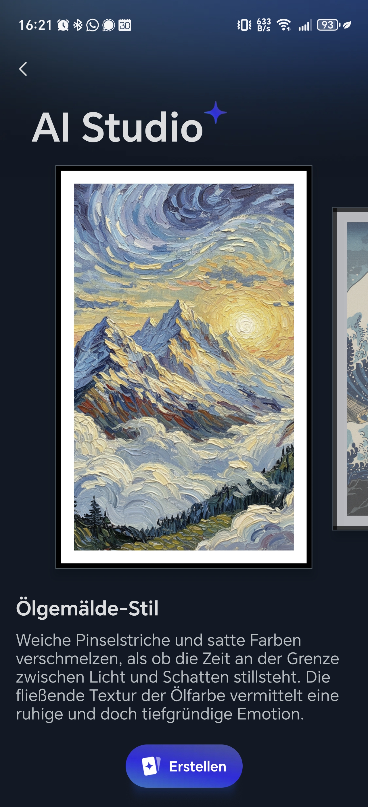 Die App verfügt außerdem über eine KI-Funktion, die jedoch kostenpflichtig ist. Damit könnt ihr Porträts in Gemälde verwandeln, klassisch über einen Prompt ein Bild erstellen oder auch durch andere Filter das Bild bearbeiten lassen. Diese Funktion ist mit 3,99€ pro Monat recht preisintensiv, wenn man bedenkt, dass viele KI-Anwendungen dies kostenlos ermöglichen.