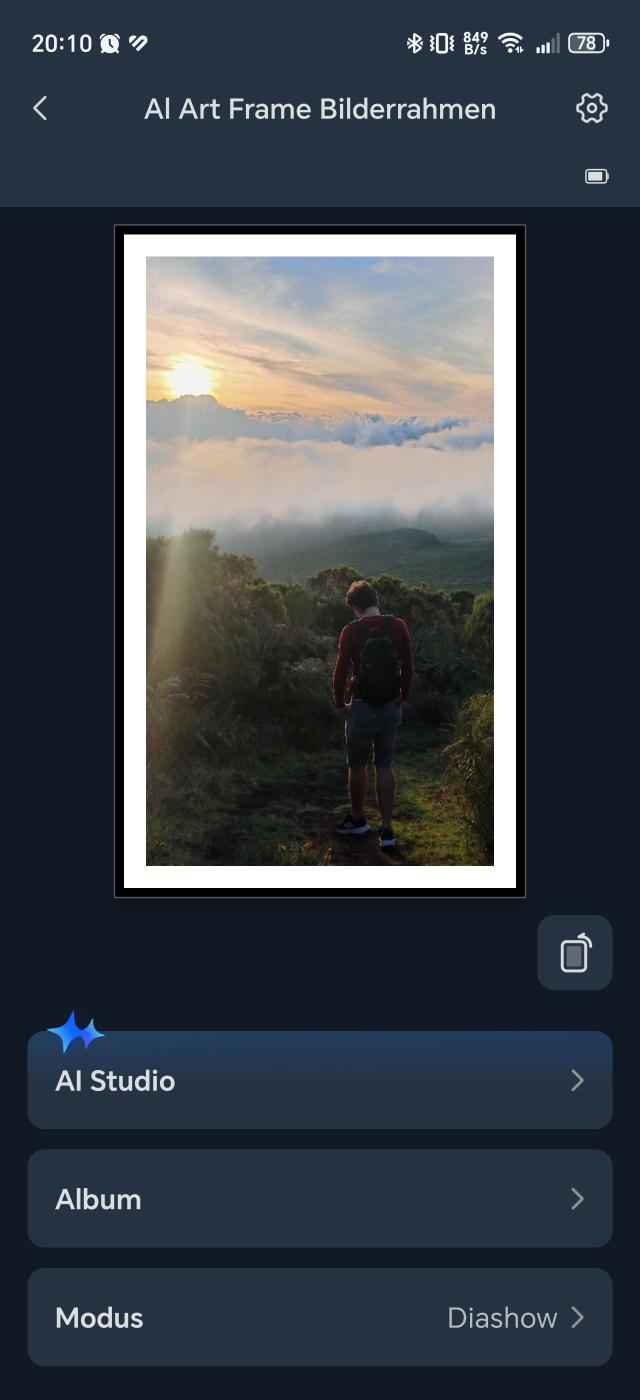 Wenn ihr ein Bild ausgewählt habt, werden euch zunächst Grundfunktionen zur Bearbeitung vorgeschlagen: Zuschneiden, Filter (Mono oder Normal) und Bildanpassungen. Anschließend wird das Bild synchronisiert und in die Cloud hochgeladen. Wenn ihr die Synchronisierung mit dem AI Art Frame startet, wird das Bild nach rund 7 Sekunden unter starkem Flackern des Displays auf dem Bilderrahmen angezeigt.