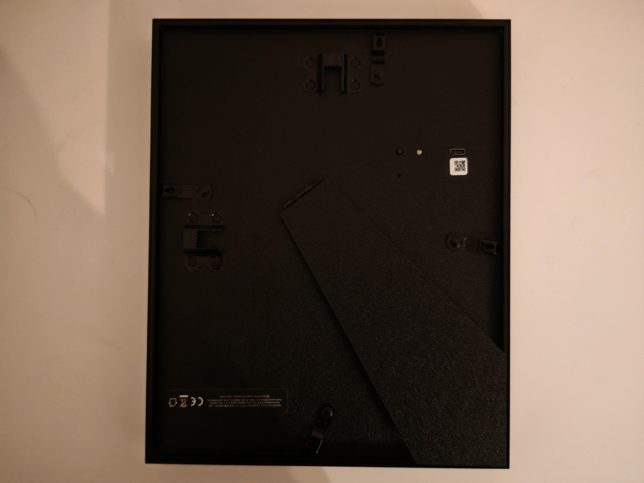 Die Rückseite ist weniger typisch für einen Bilderrahmen. Dort befinden sich ein USB-C-Anschluss zum Aufladen und eine Status-LED. Ebenso verbaut Switchbot Klammern, damit ihr den Rahmen (etwa gegen Ikea Rödalm) wechseln könnt. Haken ermöglichen die Aufhängung im Hoch- oder Querformat. Durch das Aufstellen des Ständers kann der AI Art Frame auch in beide Richtungen auf einem Schrank platziert werden.