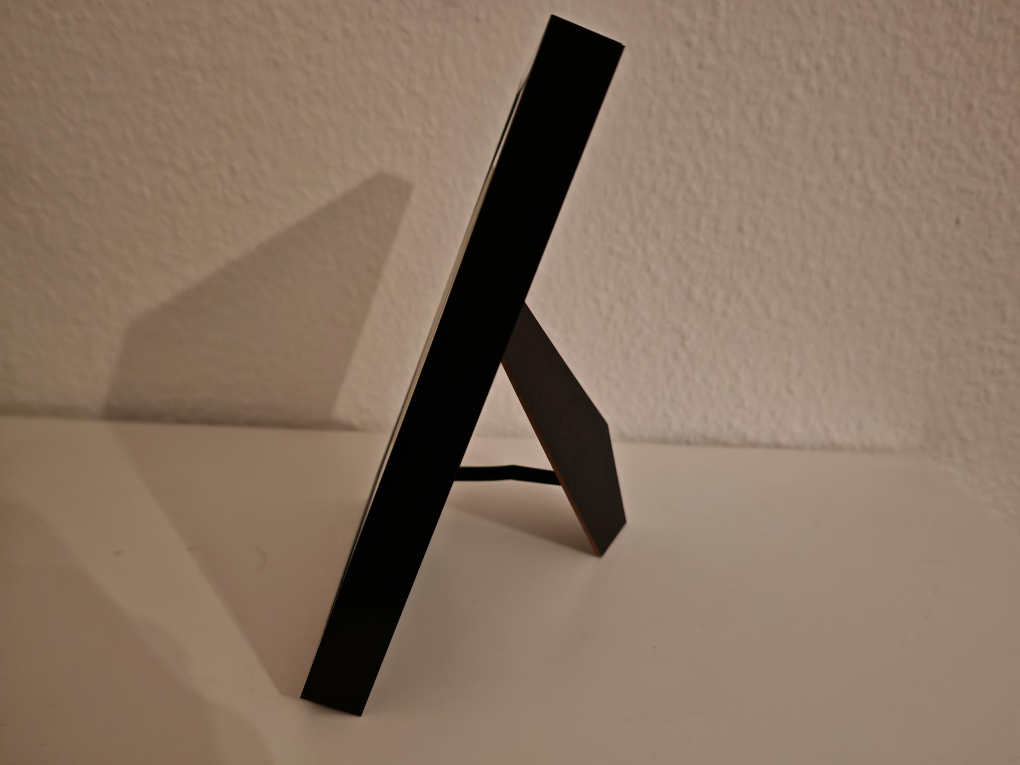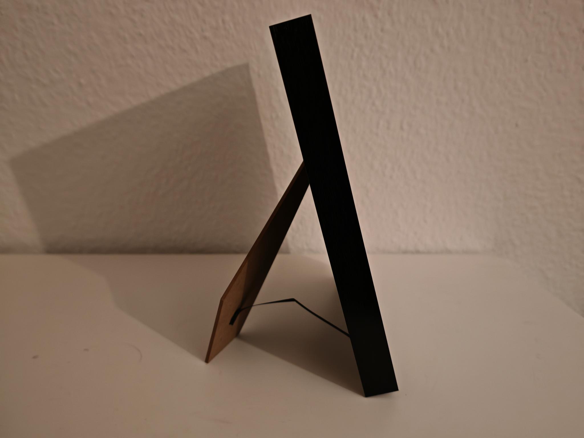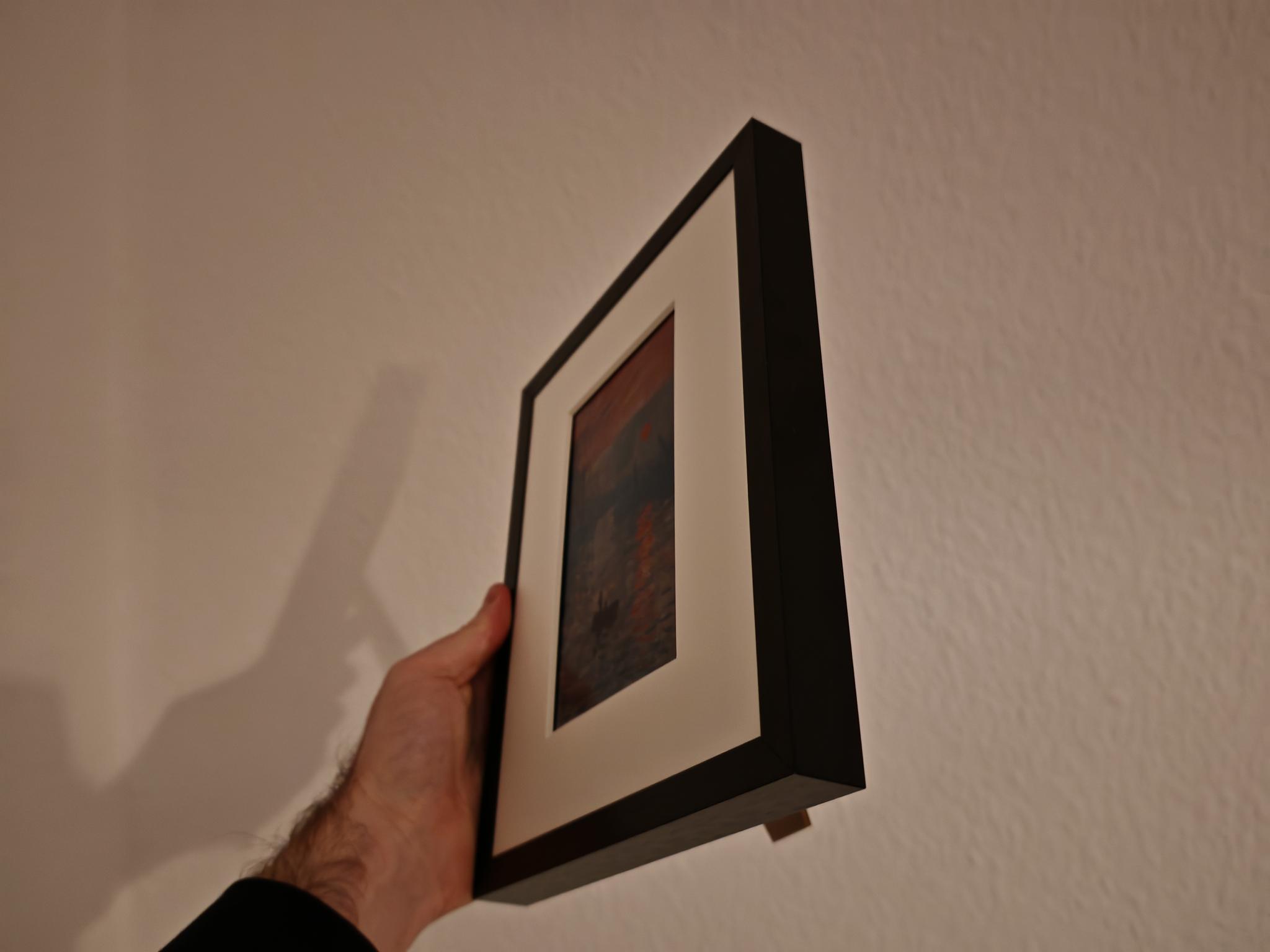 Nach außen hin wirkt der Switchbot AI Art Frame wie ein handelsüblicher schwarzer Bilderrahmen von Ikea. Das ist beabsichtigt, denn er ist mit der Ikea-Serie „Rödalm“ kompatibel. Dadurch lässt sich der schwarze Rahmen problemlos an andere Holztöne anpassen. Direkt bei Switchbot sind keine weiteren Farben bestellbar. Mit Abmessungen von 250 x 200 x 25 Millimeter ist der Bilderrahmen recht handlich. Das Gewicht von 900g lässt sich durch einen Dübel mit Nagel oder die mitgelieferten Klebehaken gut an der Wand befestigen.