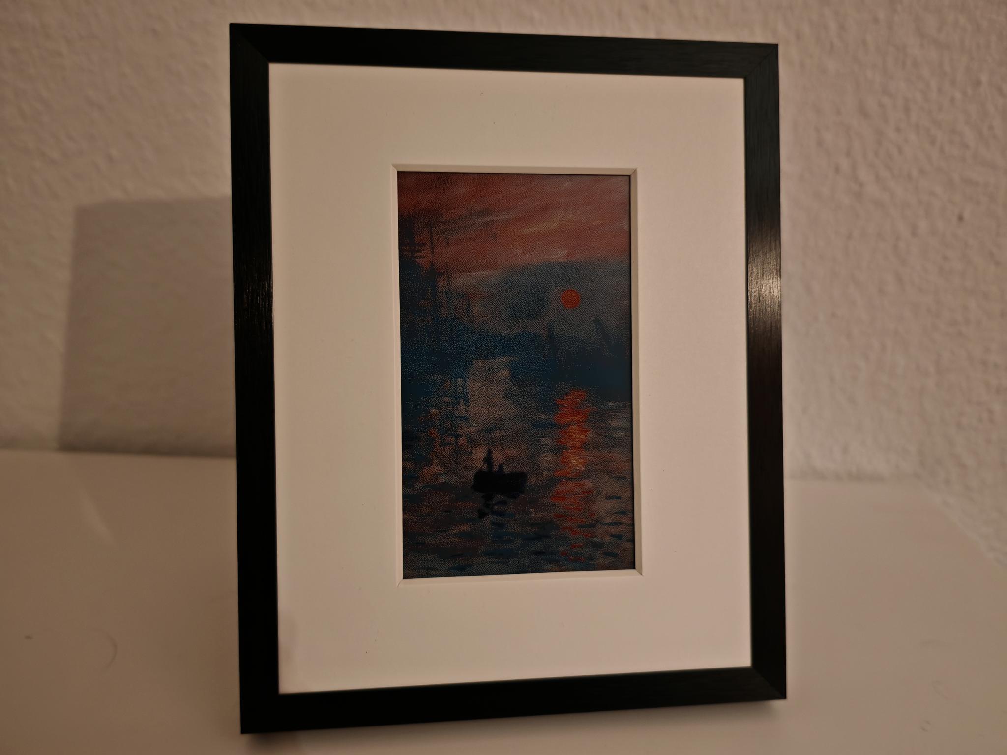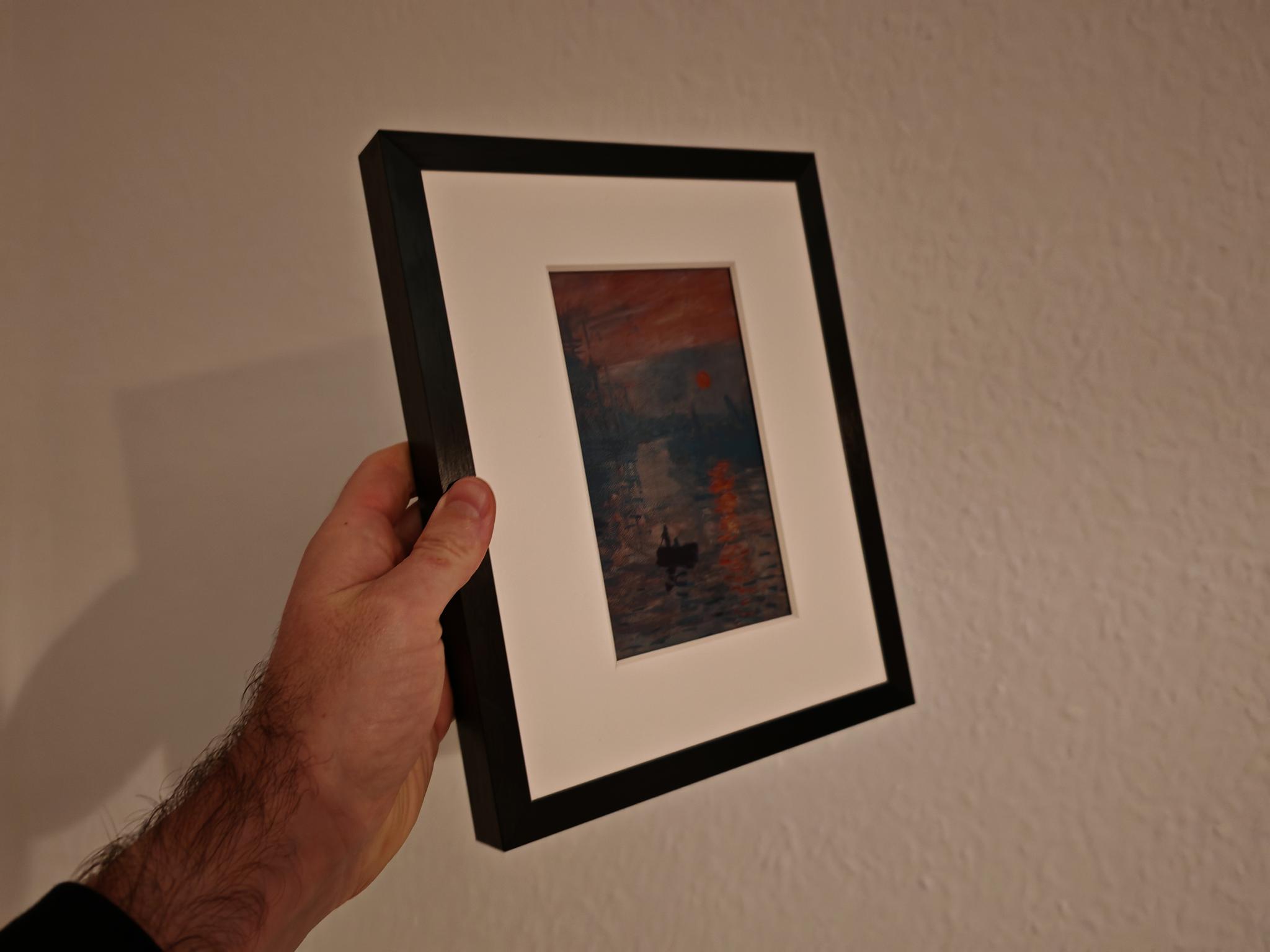 Vor allem die geringe Auflösung macht sich auf dem kleinen Display ab einem Sichtabstand von unter 50cm negativ bemerkbar. Wenn ihr den Bilderrahmen in die Hand nehmt, wirkt das Foto teilweise sehr pixelig. Auch bei pastos gemalten Kunstwerken beziehungsweise solchen, die die KI für euch erstellt hat, tritt das Problem sichtbar zutage und stört im Alltag.