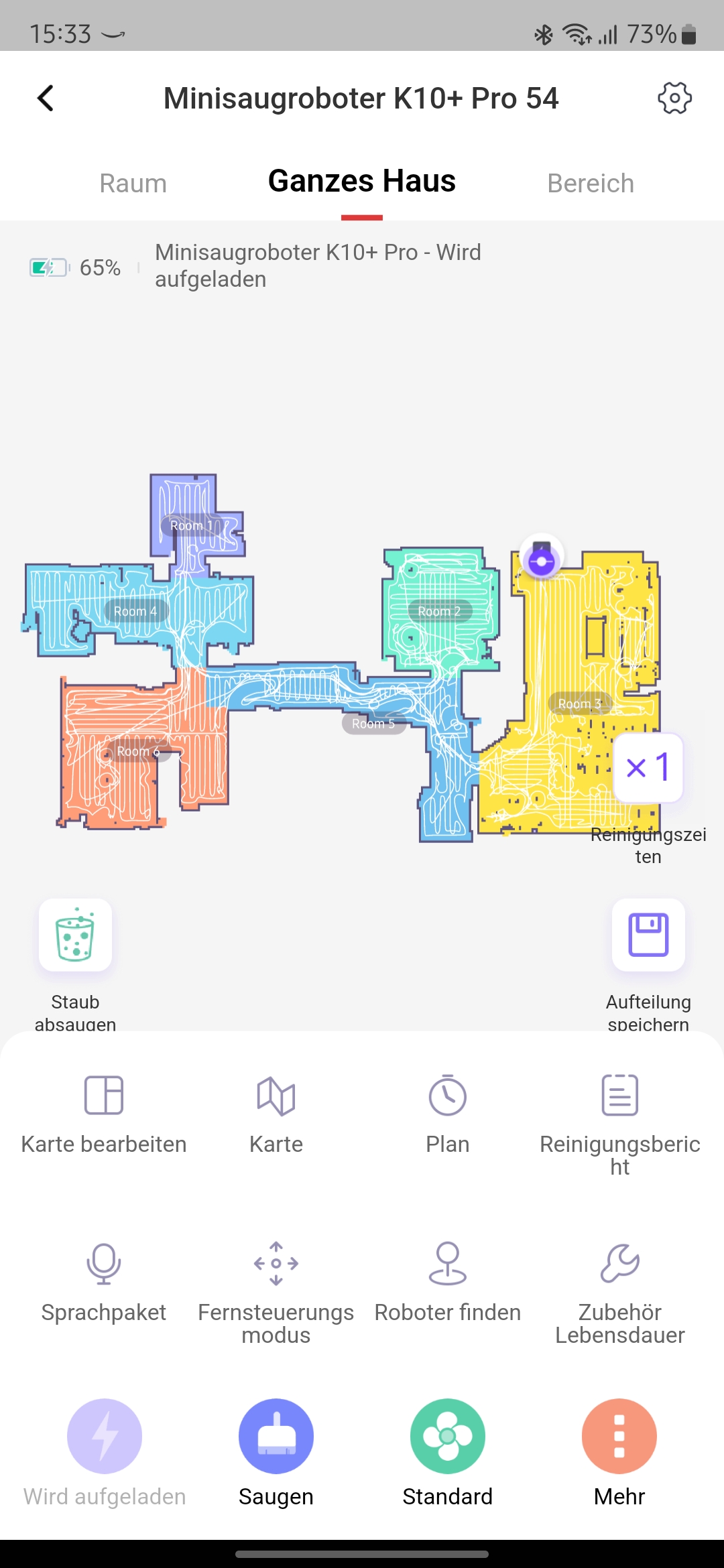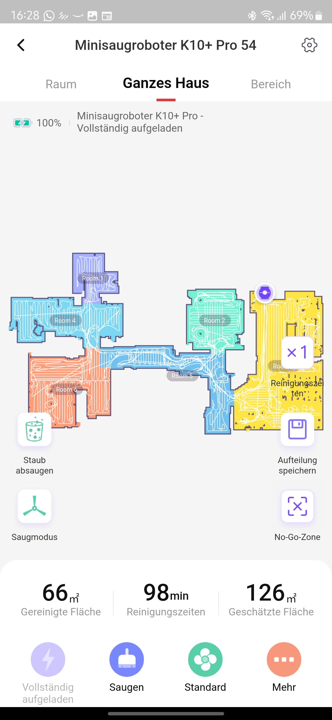 Mit 3200 mAh ist der Akku des SwitchBot K10+ Pro nicht riesig. Trotzdem verspricht der Hersteller eine lange Laufzeit. Im Standard-Modus ist die Laufzeit für solch einen kleinen Akku gut. Für meine 66 m² wurde der Akku mit nur 55% belastet. Damit sind über rund 100 m² mit einer Akkuladung realistisch. Ein zweiter Test im Modus stark war mit einer Restkapazität von 17% eher knapp. Bei 10% Restkapazität sucht der SwitchBot K10+ Pro automatisch die Station, um den Akku wieder mit Energie zu befüllen. Dabei benötigt er für eine Zwischenladung von 40% nur rund 45 Minuten. Für eine gesamte Ladung von 0 auf 100 % vergehen knapp 150 Minuten.