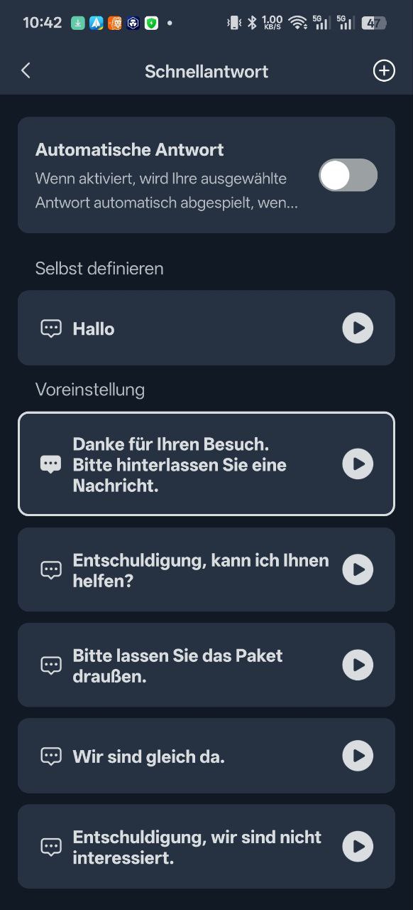 | Schnellantworten | Vorgefertigte Audio-Antworten zum Abspielen per Knopfdruck. Eigene lassen sich zusätzlich aufnehmen und auch in bestimmten Zeitfenstern automatisch abspielen. |
