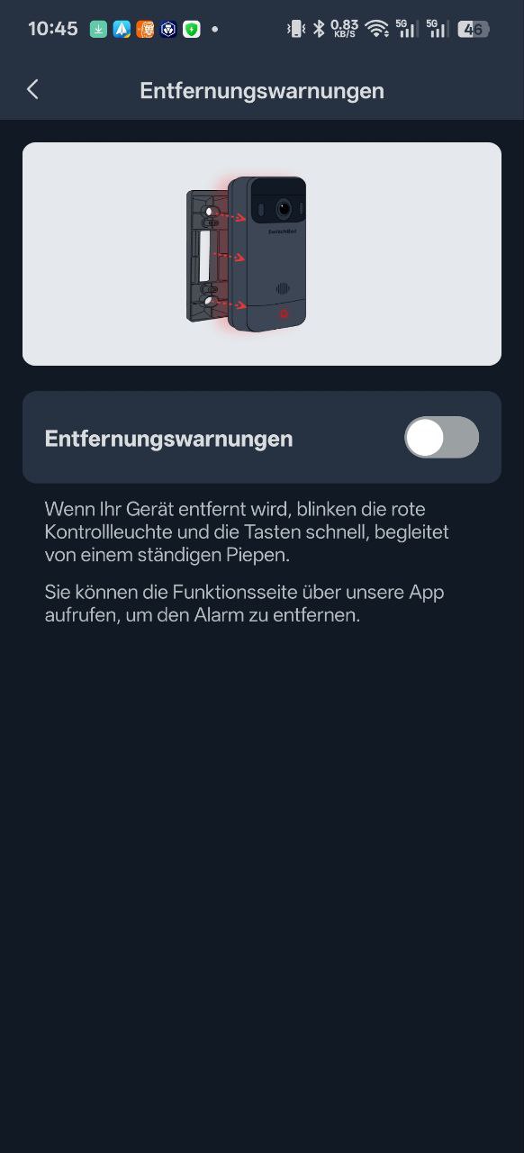 | Entfernungswarnungen | Alarm, wenn Klingel von der Halterung genommen wird (Diebstahlschutz). |