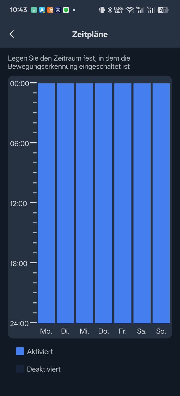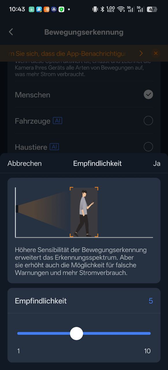 | Empfindlichkeit | Stellt ein, wie sensibel die Bewegungserkennung reagiert (Skala 1–10). |