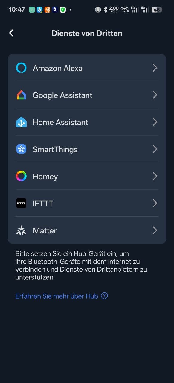 | Drittanbieter-Integration | Alexa, Google Assistant, Home Assistant, IFTTT, Matter und mehr. |
