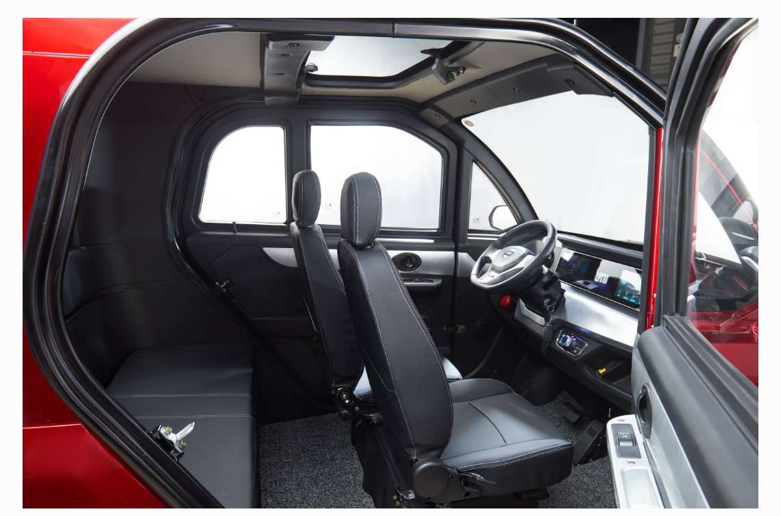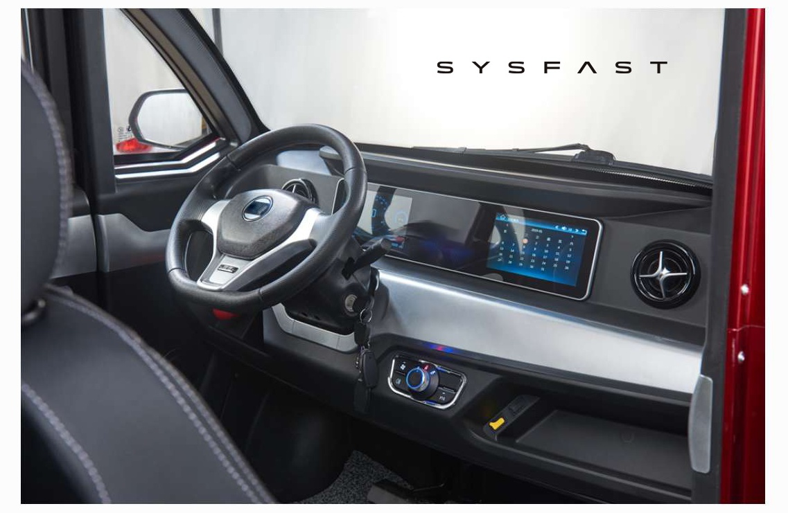 Natürlich wird im Innenraum großflächig Kunststoff verbaut, in verschiedenen Farben. Aber ein klein wenig Luxus hat es in das Minicar geschafft. Im Sysfast SZ sind elektrische Fensterheber, eine Rückfahrkamera und ein Multimediasystem mit Radio und MP3-Funktion verbaut. Dieses wird sicherlich auch für die Rückfahrkamera genutzt. Für eine ansprechende Klimatisierung kann eine Klimaanlage verbaut werden, eine elektrische Heizung ist Serie. Auf den Fotos ist noch ein Dachfenster verbaut. Ob dieses serienmäßig verbaut ist, sagt der Hersteller leider nichts. Damit ist das Fahrzeug recht komfortabel ausgestattet.