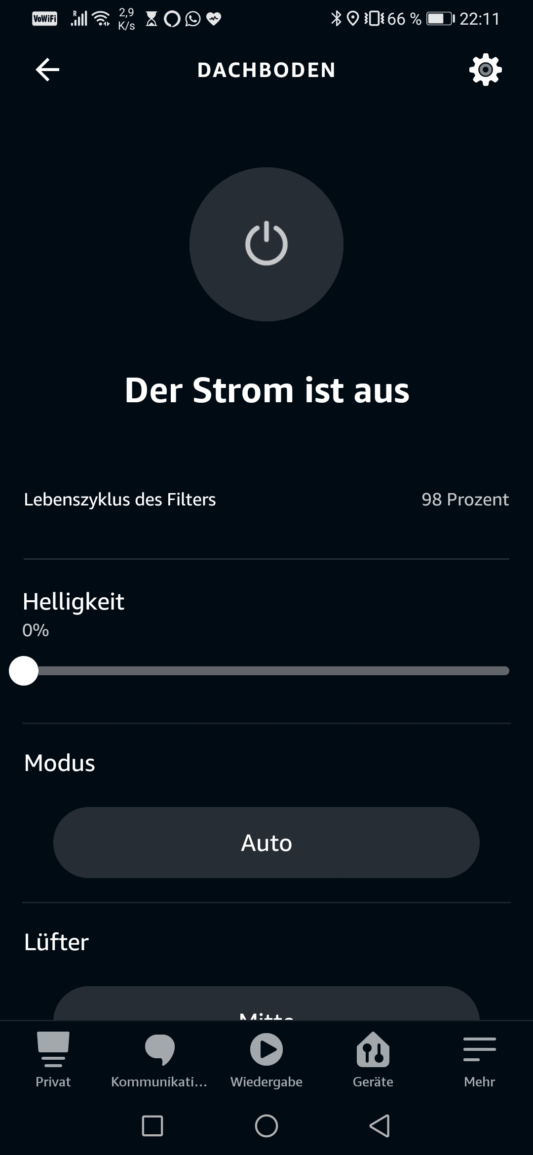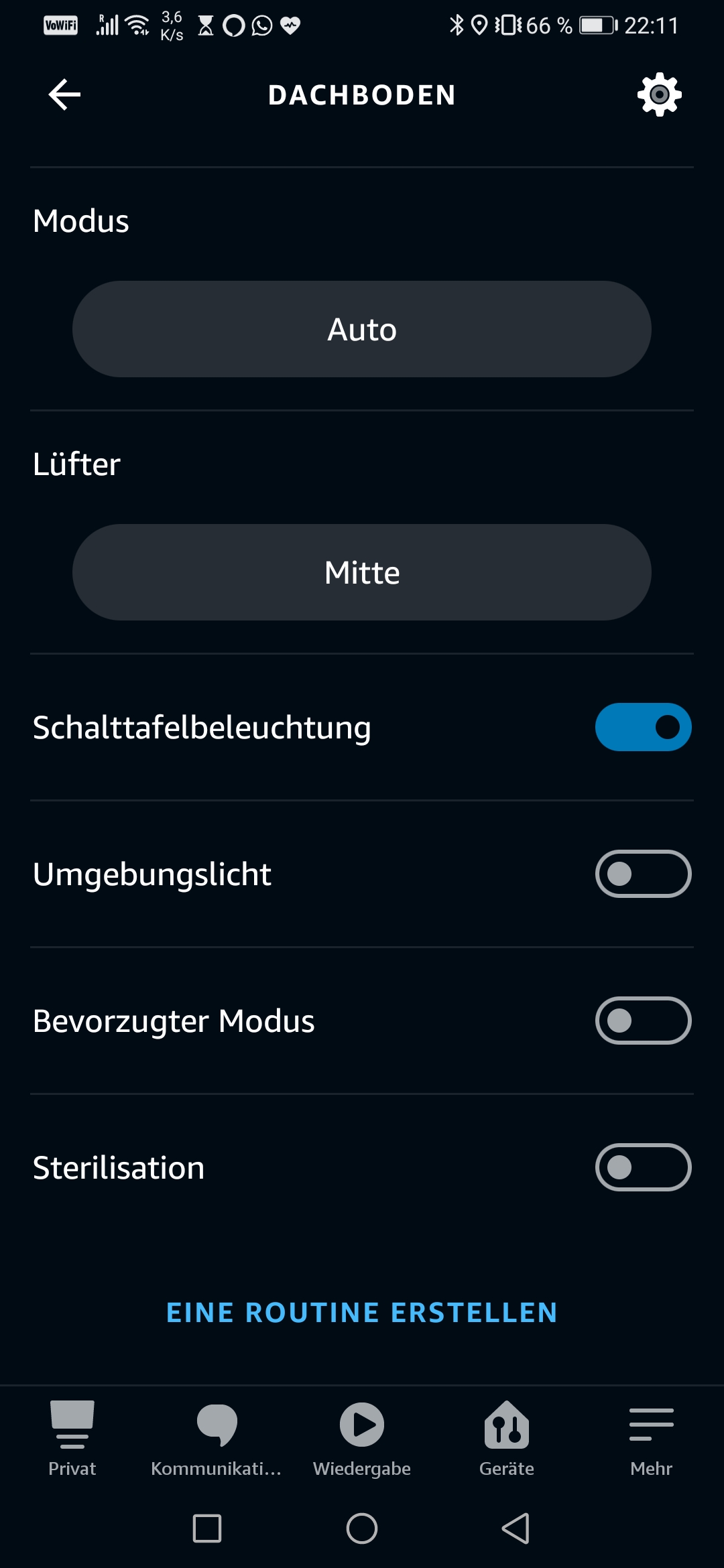 Was die App im Vergleich zur Konkurrenz von Xiaomi nicht kann: Feste Reinigungsintervalle einstellen. Das ist besonders praktisch, wenn man zu den immer gleichen Zeiten isst und gerne Gerüche “automatisch” entfernt haben möchte. Was er stattdessen kann: Leuchten! Dimmbar! Cool.