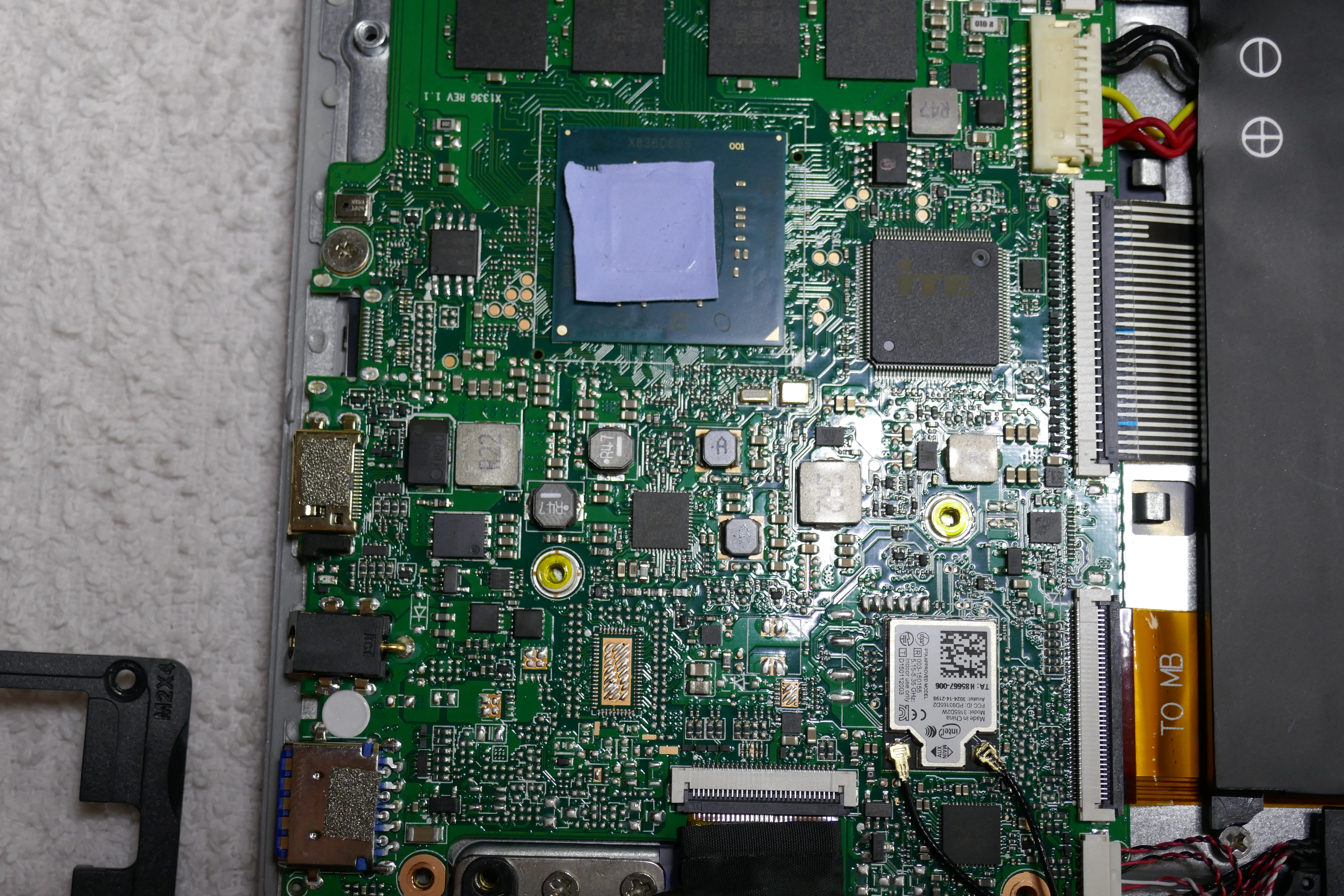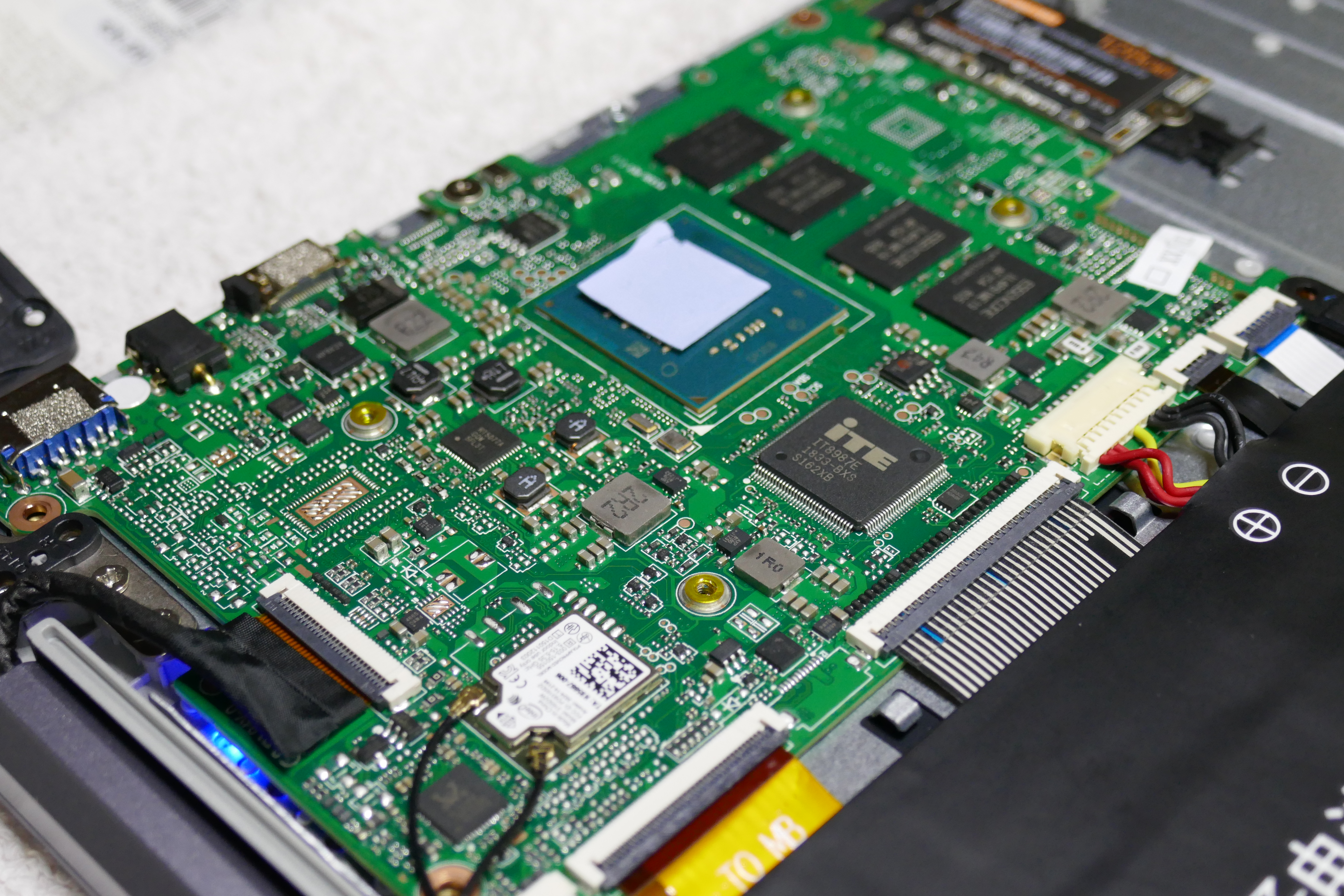 Eine BIOS-Batterie im eigentlichen Sinne gibt es übrigens nicht. Der Akku dient gleichzeitig noch als Batterie, man braucht also nur die Abeckung an der Unterseite entfernen (4 Schrauben sitzen unter den hinteren Gumminoppen) und schon kommt man ans Stromkabel (weißer Stecker mit bunten Kabeln). Kurz herausziehen, wieder einstecken – BIOS-Reset. Da ich zuerst davon ausgegangen bin, dass es eine klassische Batterie gibt, habe ich auch das Mainboard ausgebaut. Dabei habe ich entdeckt, dass Teclast keine Wärmeleitpaste nutzt sondern dieses blaue Wärmeleitpad. Die Pads leiten die Wärme aber etwas schlechter weiter, als richtige Paste, also habe ich, nachdem ich das Ding eh offen hatte, hier gleich noch Pad gegen Paste getauscht und tatsächlich ein ein, zwei Grad gut gemacht!