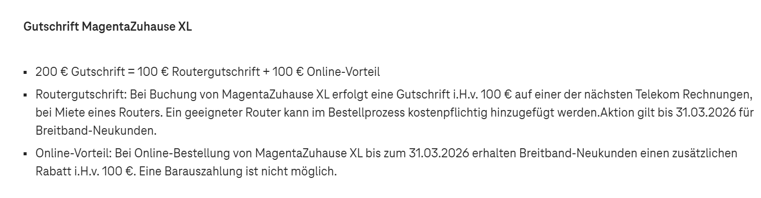 Die Routergutschrift ist verwirrend, denn laut Kleingedrucktem gibt es diesen Bonus nur, wenn ihr einen Telekom-Router als Mietgerät mitbestellt. Diesen Bonus gibt es jedoch seit vielen Jahren auch ohne Router-Bestellung. Ihr könnt das leicht testen, indem ihr beim entsprechenden Bestellschritt keinen Router auswählt. Der Bonus bleibt trotzdem im Warenkorb.