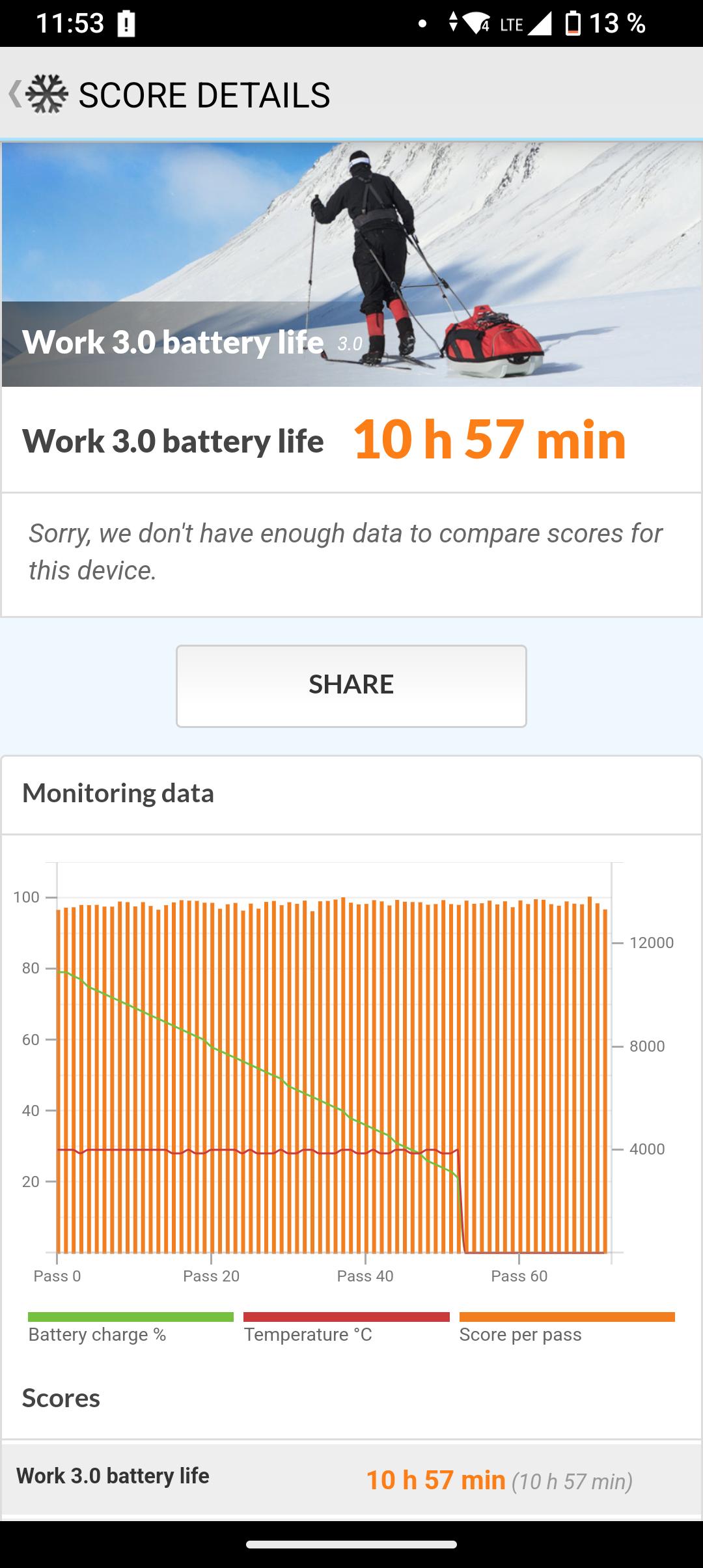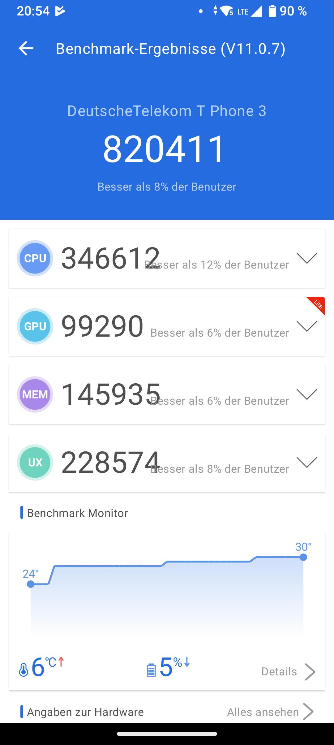 Mit 5.000mAh ist der Akku des T-Phone 3 ausreichend groß für eine angenehme Laufzeit. Allerdings machen die leuchtschwache Anzeige und die fehlende Optimierung des Systems diesen Plan zunichte. So verbleibt das Smartphone relativ lange bei konstanten 120 Hertz und reduziert nur gelegentlich auf 60 Hertz Bildwiederholungsfrequenz.