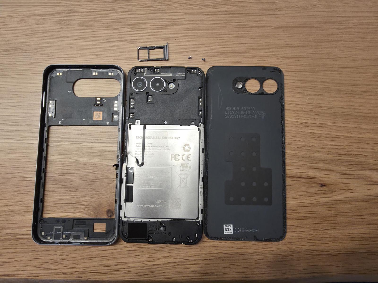 In der Anleitung wird der Akkutausch bebildert erklärt und tatsächlich kann innerhalb von fünf Minuten der Energiespeicher des T-Phone 3 getauscht werden. Dazu müssen einfach die beiden Torx-Schrauben gelöst und der SIM-Schlitten entfernt werden. Danach wird der Rahmen vom Bildschirm gelöst. Ein Plektrum oder eine Kreditkarte können zum Aufhebeln hilfreich sein. Leider habe ich während des Tests an der Rückseite gezogen, die nur geklebt ist und sich relativ leicht löst. So sollte es auf keinen Fall laufen, denn die Rückseite sollte am Rahmen verbleiben. Trotz meines Fauxpas ist der Nachhaltigkeitsgedanke lobenswert und definitiv ein positives Merkmal des T-Phone 3.