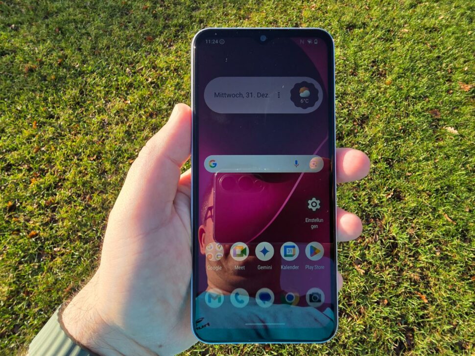 Mit 6,58 Zoll ist der Bildschirm des T-Phone 3 ein gutes Mittelmaß. Immerhin bekommt ihr mit 2408 x 1080 Pixel eine astreine Auflösung geboten und einzelne Pixel sind bei einer Pixeldichte von 466 Pixel pro Zoll nicht mehr zu erkennen. Dazu beträgt die maximale Bildwiederholungsfrequenz des IPS-Panels 120 Hertz. Bis hierhin war ich glücklich, bis ich das T-Phone 3 das erste Mal im Sonnenlicht nutzen wollte. Mit maximal 377 Lux ist die Helligkeit im Freien spürbar zu gering.