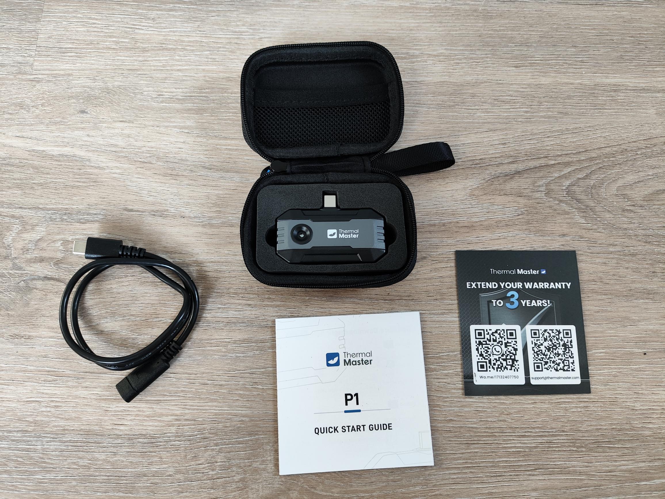Trotz des günstigen Einstiegspreises liefert Thermal Master die P1 mit einer praktischen Aufbewahrungstasche und einem USB-C Verlängerungskabel aus. Weiterhin erhaltet ihr eine Kurzanleitung und die Garantiekarte mit der ihr die Herstellergarantie auf bis zu 3 Jahre erweitern könnt.