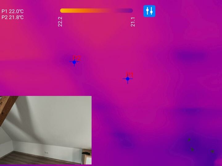 In unserem Dachgeschoss werden selbst Temperaturunterschiede von nur 0,2°C auf der Wandfläche mehr als deutlich dargestellt. An diesen stellen verlaufen die Dachsparren wodurch die Dämmung etwas geringer ausfällt. Auch für die Inspektion von technischen Geräten eignet sich die P1. Heiße Bauteile an elektronischen Geräten oder im Kfz-Bereich können somit lokalisiert werden.
