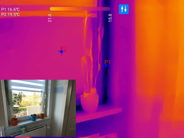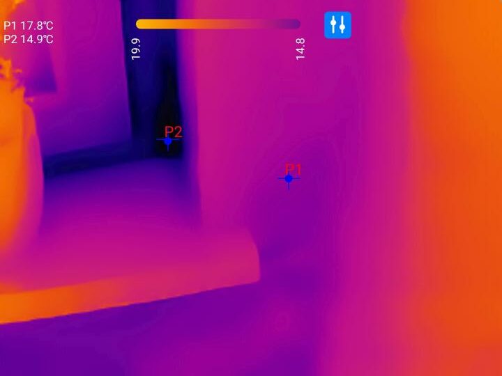 Für das Auffinden von Wärmebrücken, defekten Rohren oder für das Lokalisieren von Hotspots sind solche Details sowieso zweitrangig. Hier ist Empfindlichkeit des Wärmebildsensors und der dazugehörigen Visualisierungssoftware weitaus entscheidender. In dieser Disziplin schneidet die Thermal Master P1 vorbildlich ab. Temperaturunterschiede an Fensterlaibungen, Wandübergängen oder angrenzendem Mauerwerk sind klar ersichtlich und werden ausreichend Detailreich dargestellt. Für den Hobbyhandwerker sind somit fehlerhafte Isolierungen oder schlecht gedämmtes Mauerwerk klar ersichtlich.