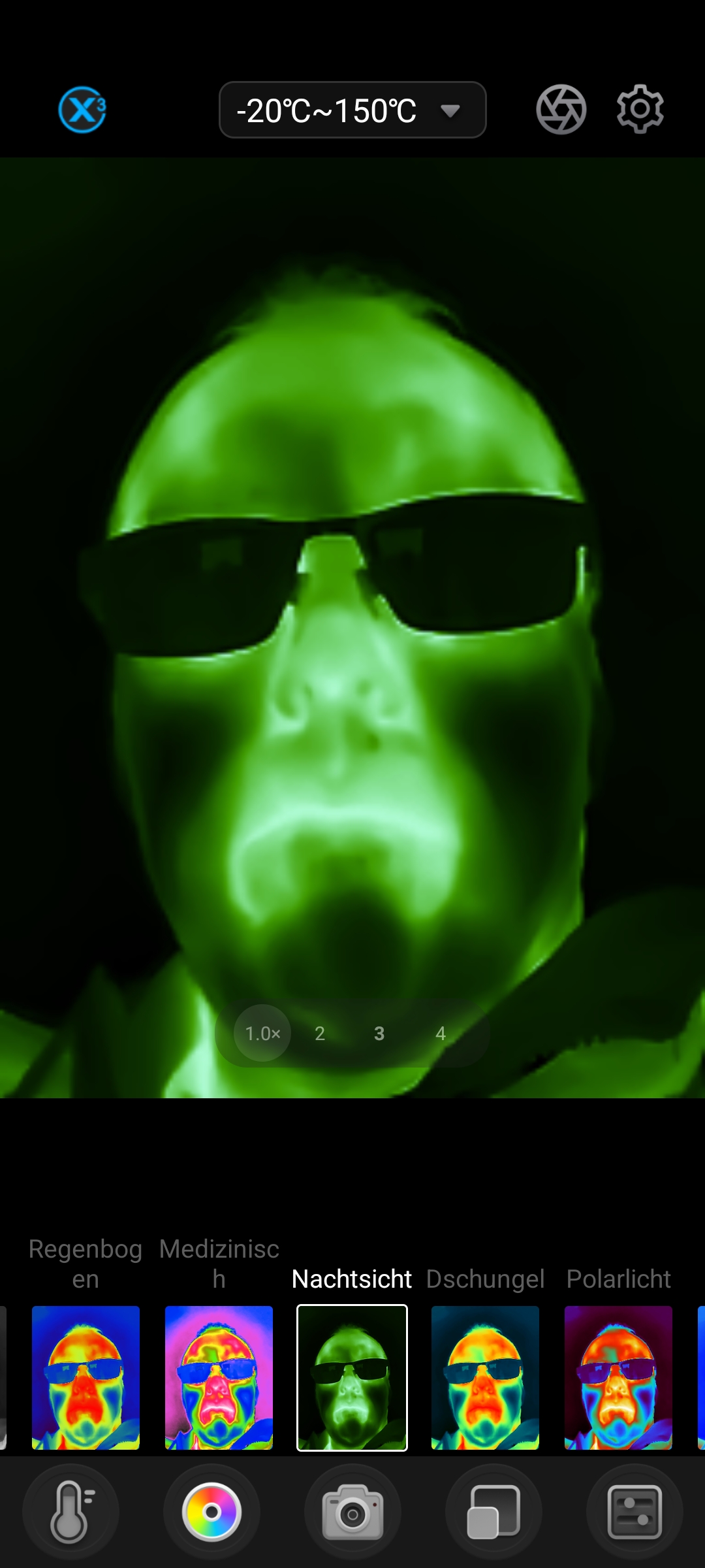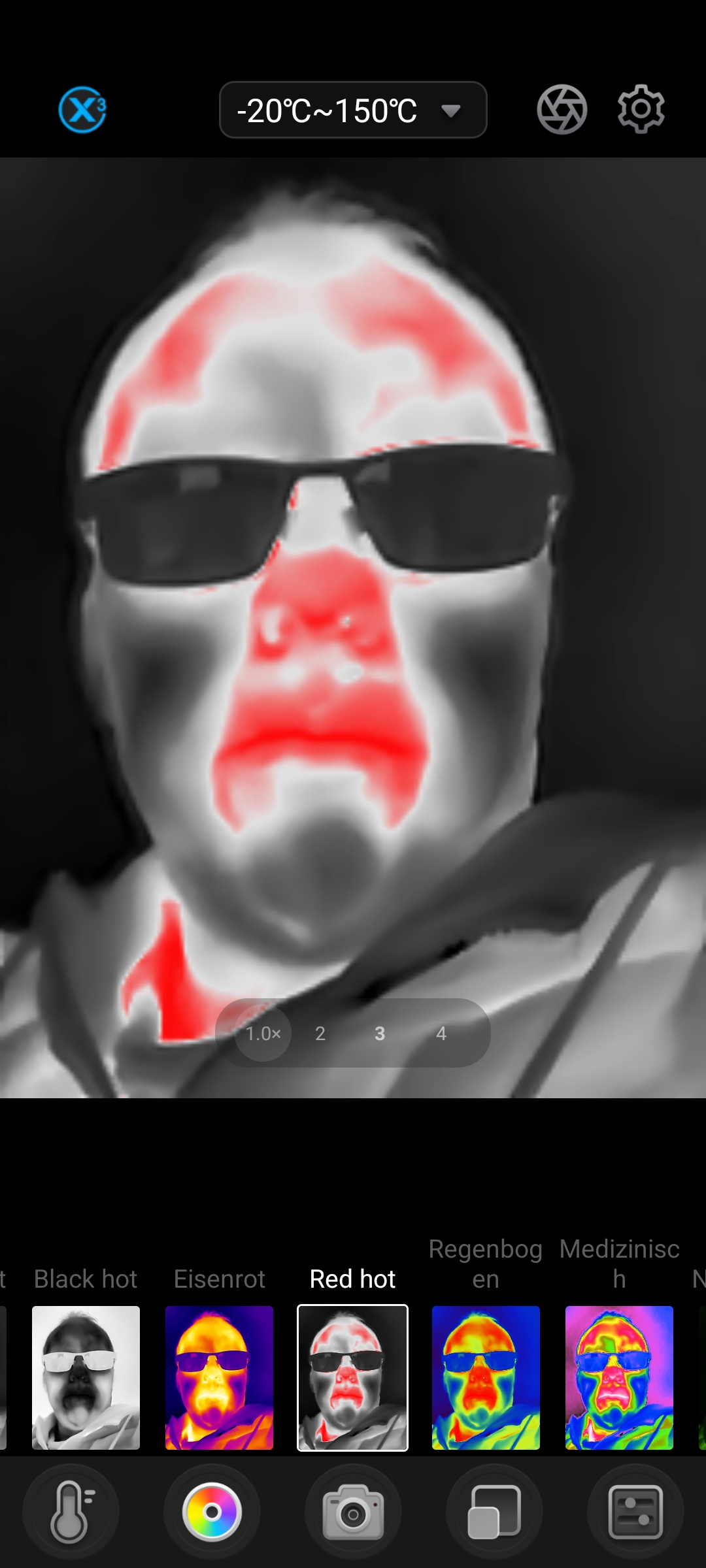 Insgesamt stehen euch 12 Farbpaletten für die Auswertung eurer Thermografieaufnahmen zur Verfügung. Je nachdem unter welchem Aspekt man die Bilder auswerten möchte (Hotspot, Wärmebrücke, Bewegung einer Wärmequelle) können verschiedene Farbspektren sinnvoll sein. Zusätzlich zum Wärmebild könnt ihr auch das normale Bild eurer Handykamera einblenden lassen. Somit könnt ihr im späteren Verlauf jederzeit nachvollziehen, welches Objekt ihr untersucht habt.