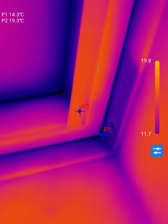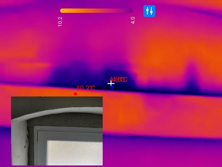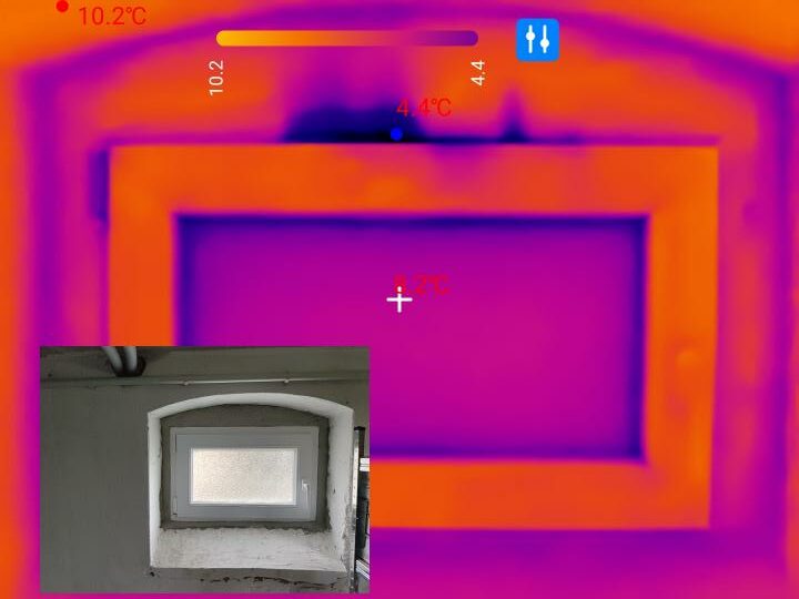 An diesem Kellerfenster wird eine deutlich kältere Region oberhalb des Rahmens ersichtlich. Während ich anfangs einen unzureichenden Anpressdruck oder defekte Dichtgummis im Verdacht hatte, wurde bei genauerer Betrachtung ein Bruch des Fensterrahmens im betroffenen Bereich deutlich. Hier hilft dementsprechend nur ein Austausch des kompletten Fensterrahmens.